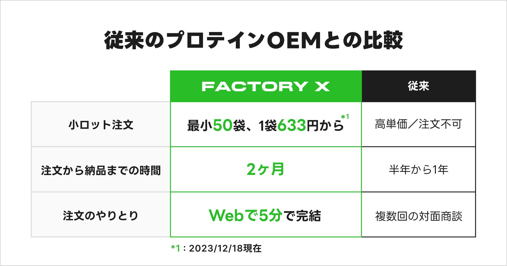 Factory XはOEM革命であると確信しています。従来のOEM製造では企画の段階から打ち合わせを複数回実施するため、OEM会社の工数を最小ロットや価格に反映するしかありませんでした。また、商品化までのリードタイムも非常に長いというボトルネックもありました。DXによってこれらの課題を解決し、OEM製造の民主化を進めたいと考えています。まずはプロテインからスタートしていますが、今後はさまざまな商品に応用してまいります。