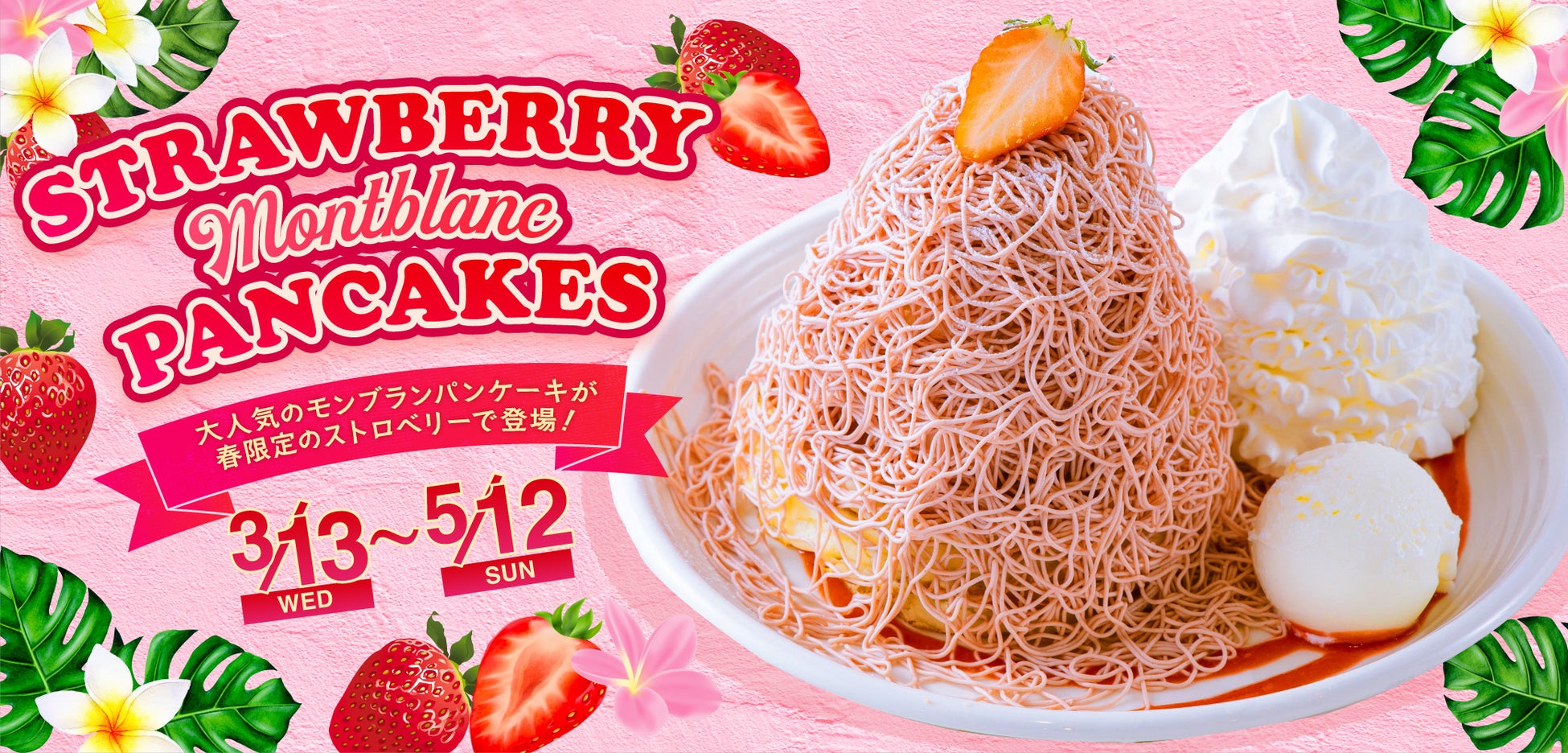 <ストロベリー×北海道産クリームチーズ>の絞りたてモンブランクリームを使用したハワイ仕立ての「ストロベリーモンブランパンケーキ」新登場!2024年3月13日(水)から全国のコナズ珈琲にて期間限定で販売