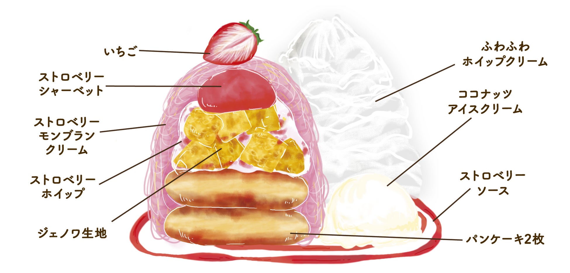 全体を覆うコナズ珈琲オリジナルのストロベリーモンブランクリームの内側には、さっぱりとしたストロベリーシャーベットや、ストロベリーホイップを絡ませたふわふわのジェノワ生地(スポンジ生地)が詰まっており、食べるたびに新しい味わいに出会えるパンケーキに仕上げています。