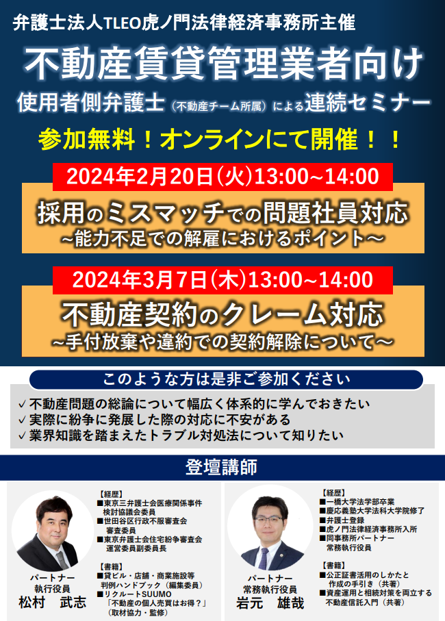 そこで今回、不動産問題の解決に注力してきた弁護士がこれまでの経験を踏まえ、「問題社員対応セミナー(採用のミスマッチにおけるローパフォーマー対応)」を開催いたします。