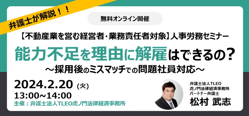 「問題社員対応セミナー(採用のミスマッチでのローパフォーマー対応)」を無料・オンラインにて開催いたします。【経営者向けセミナー】【弁護士による60分解説】
