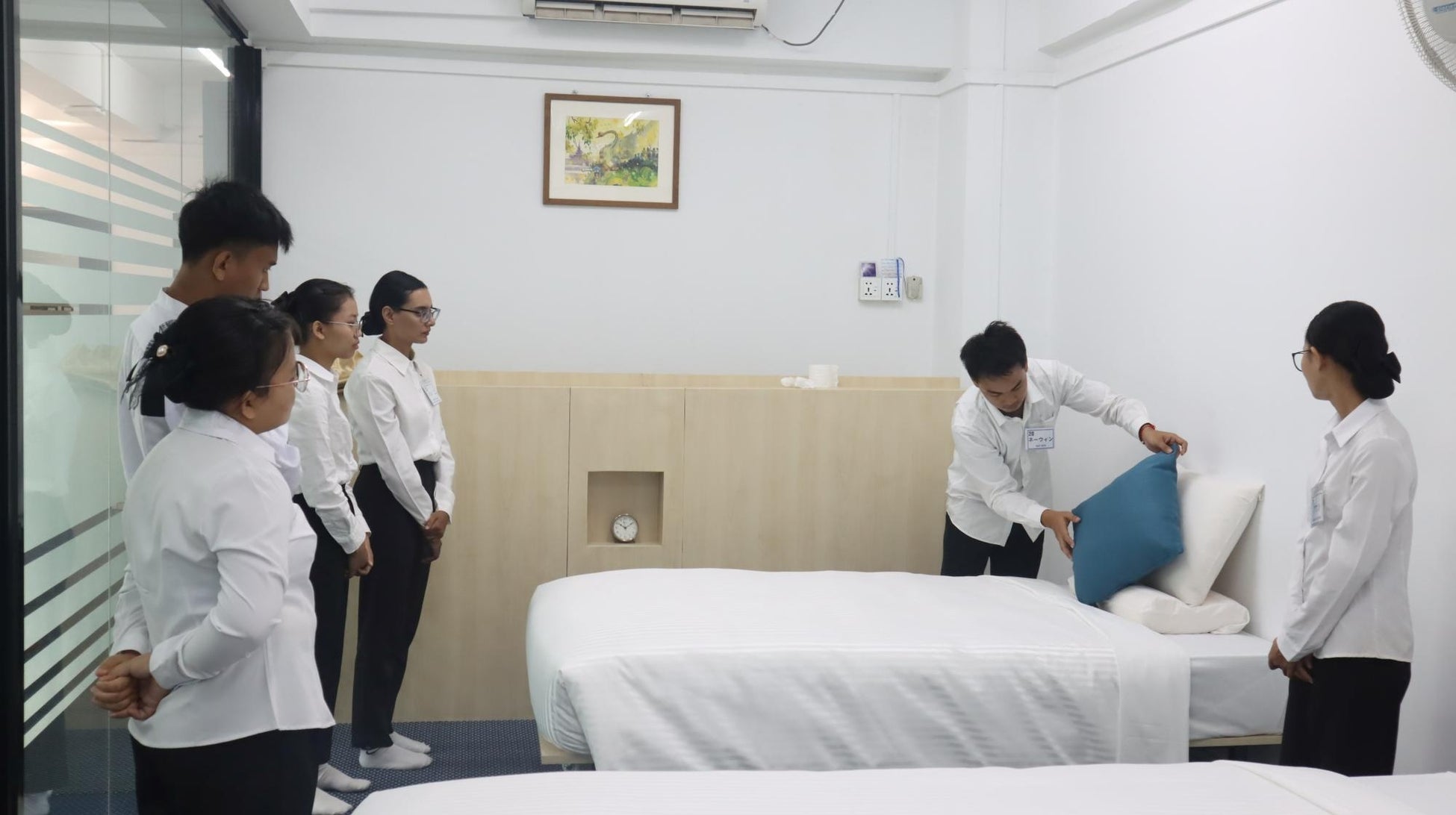 本アカデミーでは、日本語や日本の生活様式を学ぶだけでなく、施設内に設けたホテルの客室を想定したモックアップルームでの客室清掃のほか、飲食サービスの業務など宿泊施設での就業に必要なレストラン研修などを座学で学ぶことが可能です。ホテル業のそれぞれの分野を極めたプロフェッショナルな講師陣からホテルにまつわるさまざまな技術指導が受けられるのが特徴です。
