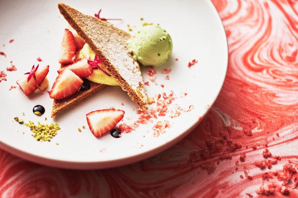 フレッシュないちご、ピスタチオアイスクリーム、サクサクのミルフィーユ生地の見事な融合に、フローズンイチゴを大胆にシェイブ。さまざまな食感が愉しめるひと皿です。