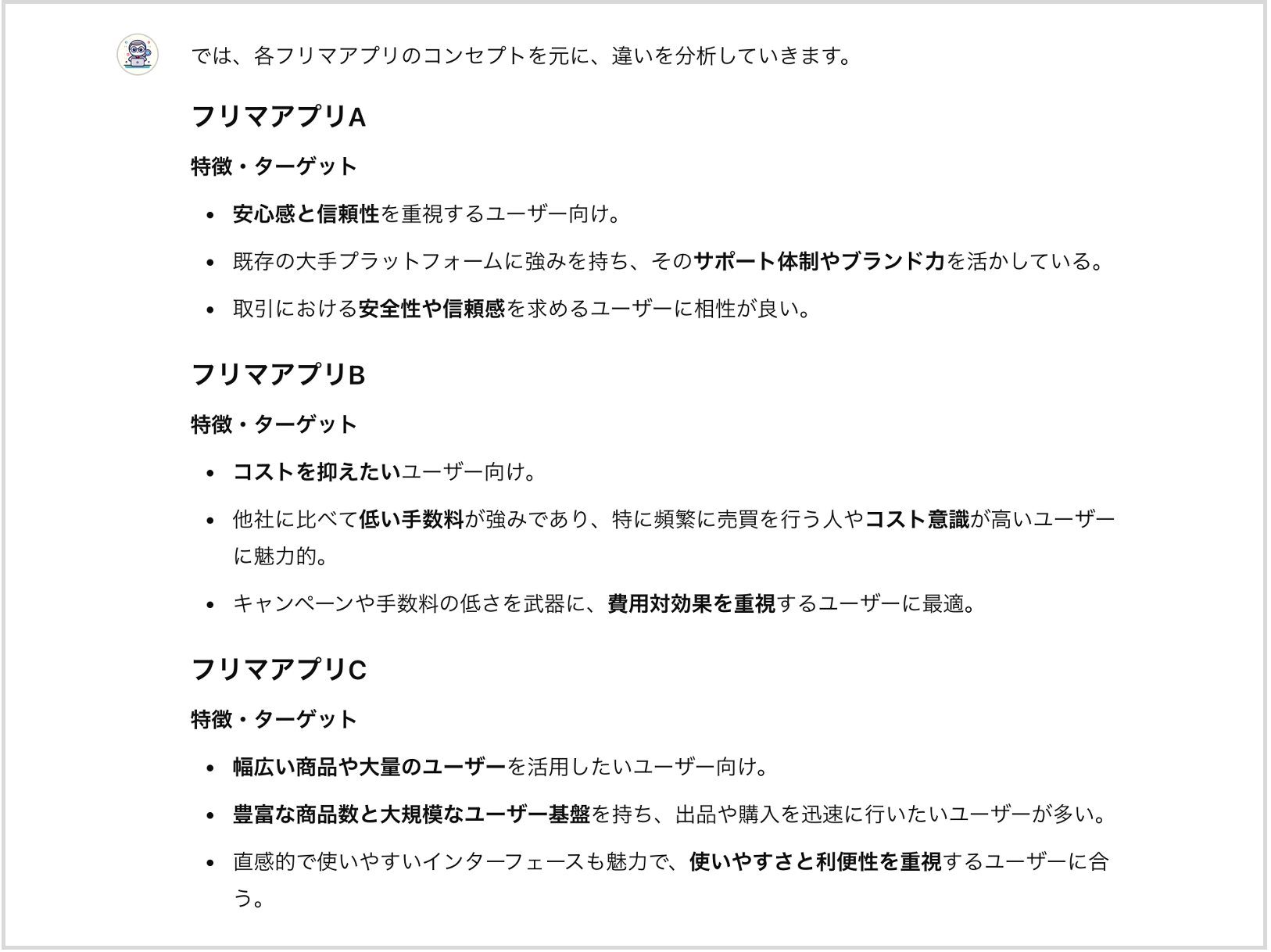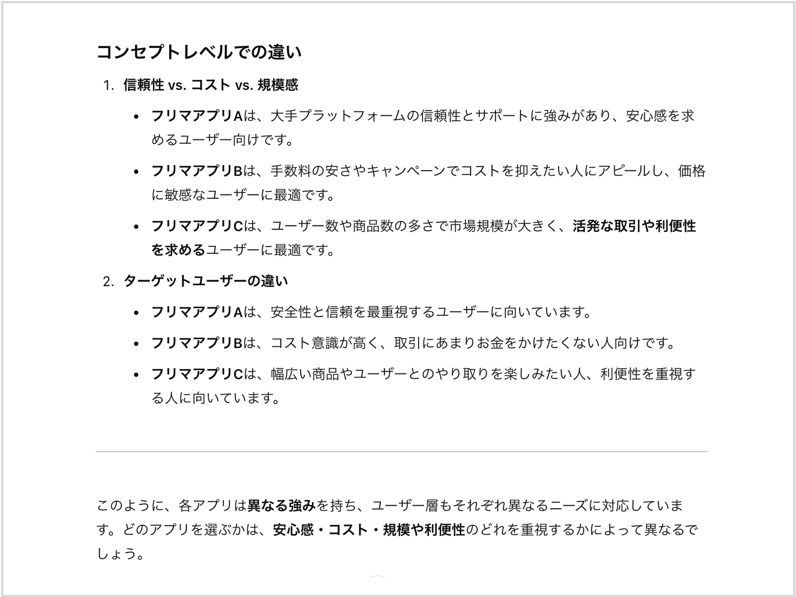 これら2つのGPTsを活用することで、競合リサーチを目的やニーズに応じて柔軟に進めることが可能になります。競合サービスの本質的なコンセプトや価値を深く理解したい場合は、「【競合サービスのコンセプト】をURLひとつで抽出」が最適です。一方、複数の競合サービスを比較し、顧客がそれを選ぶ理由やサービス間の違いを分析したい場合は、「【競合サービスが選ばれる理由】をURLひとつで抽出」が役立ちます。目的に応じて、それぞれのツールを効果的に活用することで、競合他社の強みや顧客の心理を的確に把握し、新規事業戦略を効率的に策定することが期待できます。