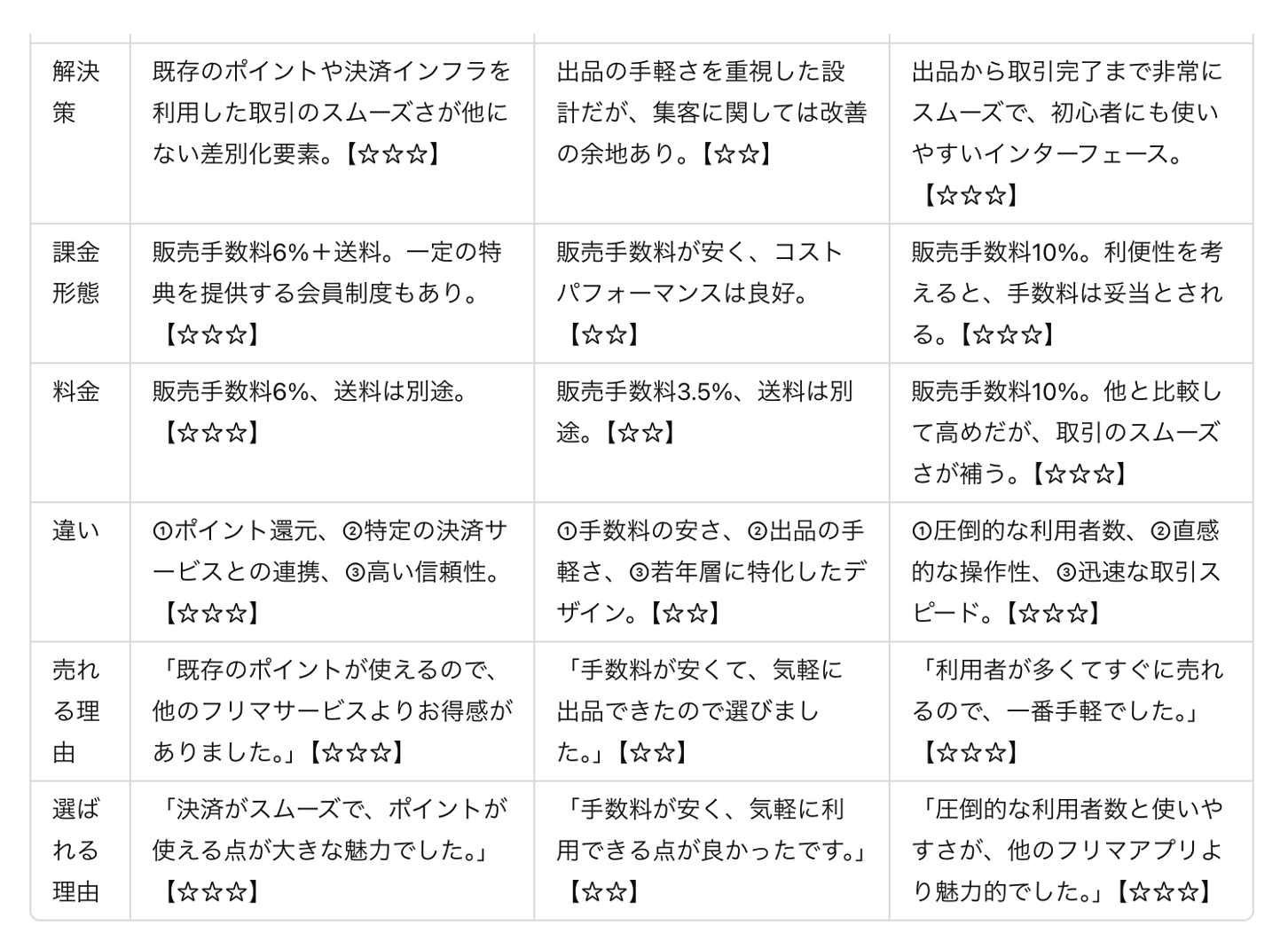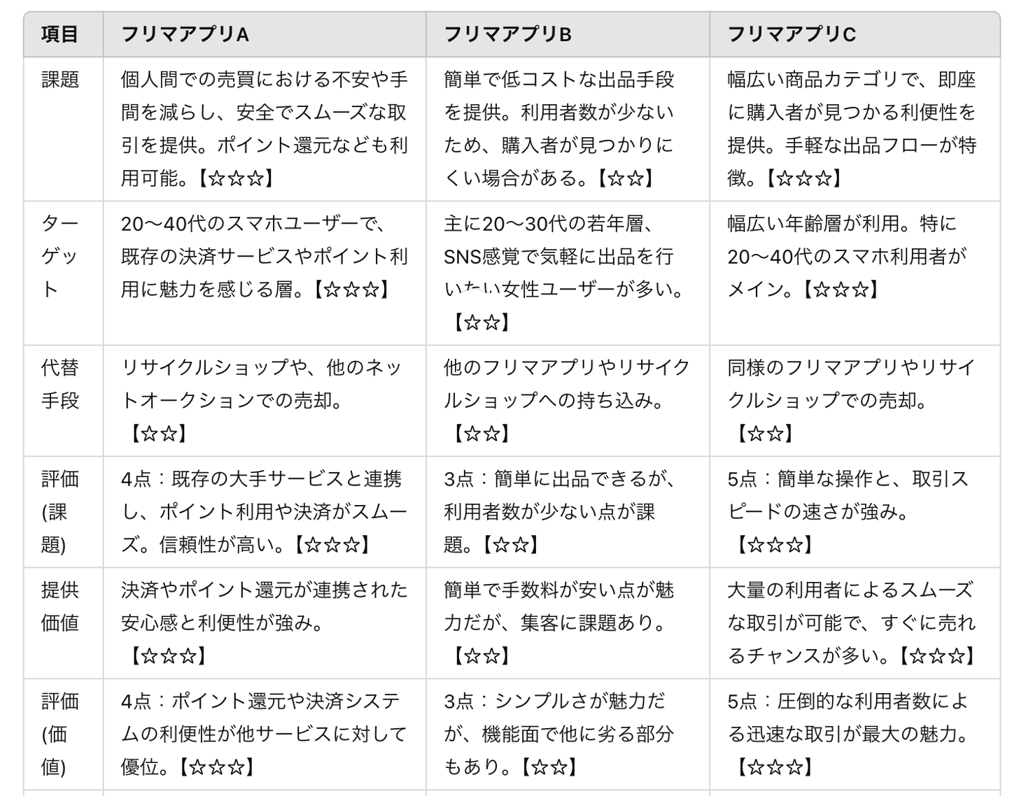 このGPTsは、複数のサービスを横断的に比較・分析し、表形式で情報を整理することに特化しています。料金体系や提供価値、ターゲット層などを一目で理解できるようにし、競合間の違いや共通点を明確にすることで、差別化ポイントを可視化します。これにより、各サービスの特徴を直感的に把握でき、競合との差を踏まえた効果的な戦略立案が可能になります。