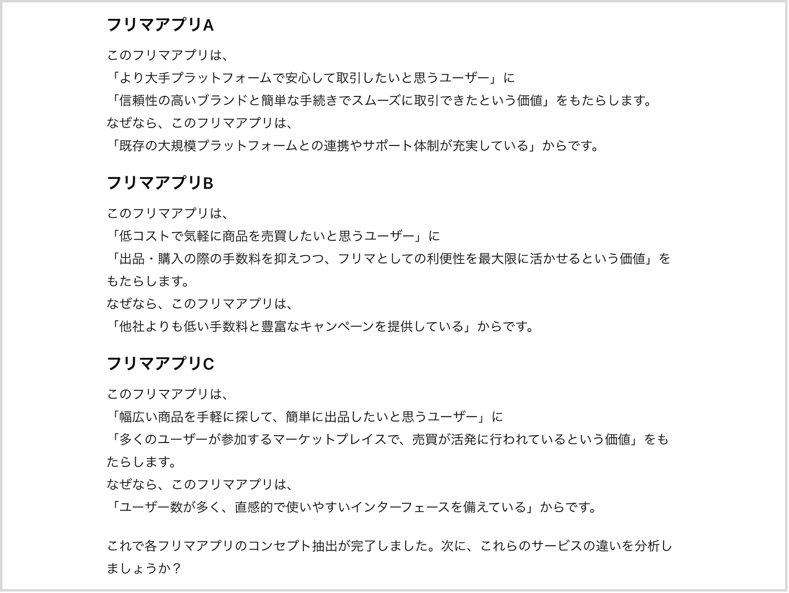 このGPTsは、サービスや製品のコンセプトを文章形式で簡潔に抽出します。そのサービスが「誰に(課題)、どんな喜びを(価値)、どう提供しているのか(解決策)」を明確にし、サービスの本質的な価値や強み、ターゲットユーザーを深く理解することができます。特に、各サービスの概要を迅速に把握し、戦略の初期段階でのアイデア創出に役立ちます