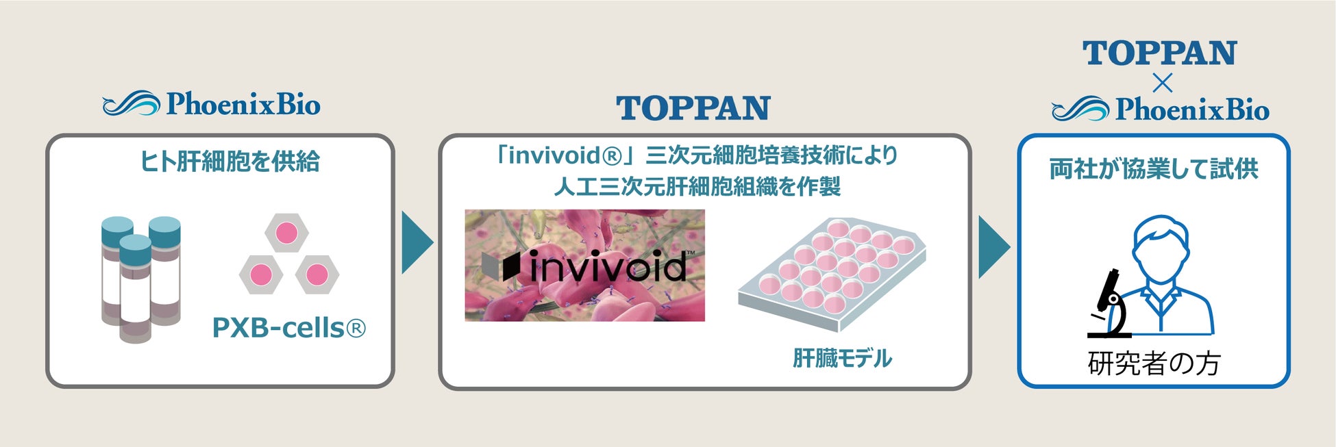 TOPPANホールディングスは、これまでに3D細胞培養技術「invivoid®」を大阪大学大学院工学研究科 松﨑典弥教授と共同で開発しており、がん個別化医療、創薬研究、培養肉などに向けた研究を進めています。本業務提携により、TOPPANホールディングスの「invivoid®」とフェニックスバイオの新鮮ヒト肝細胞「PXB-cells®」を組み合わせた「人工三次元肝臓組織」(以下 肝臓モデル)について共同での試供を開始します。