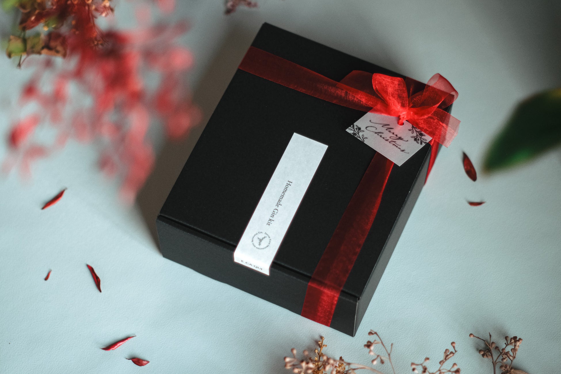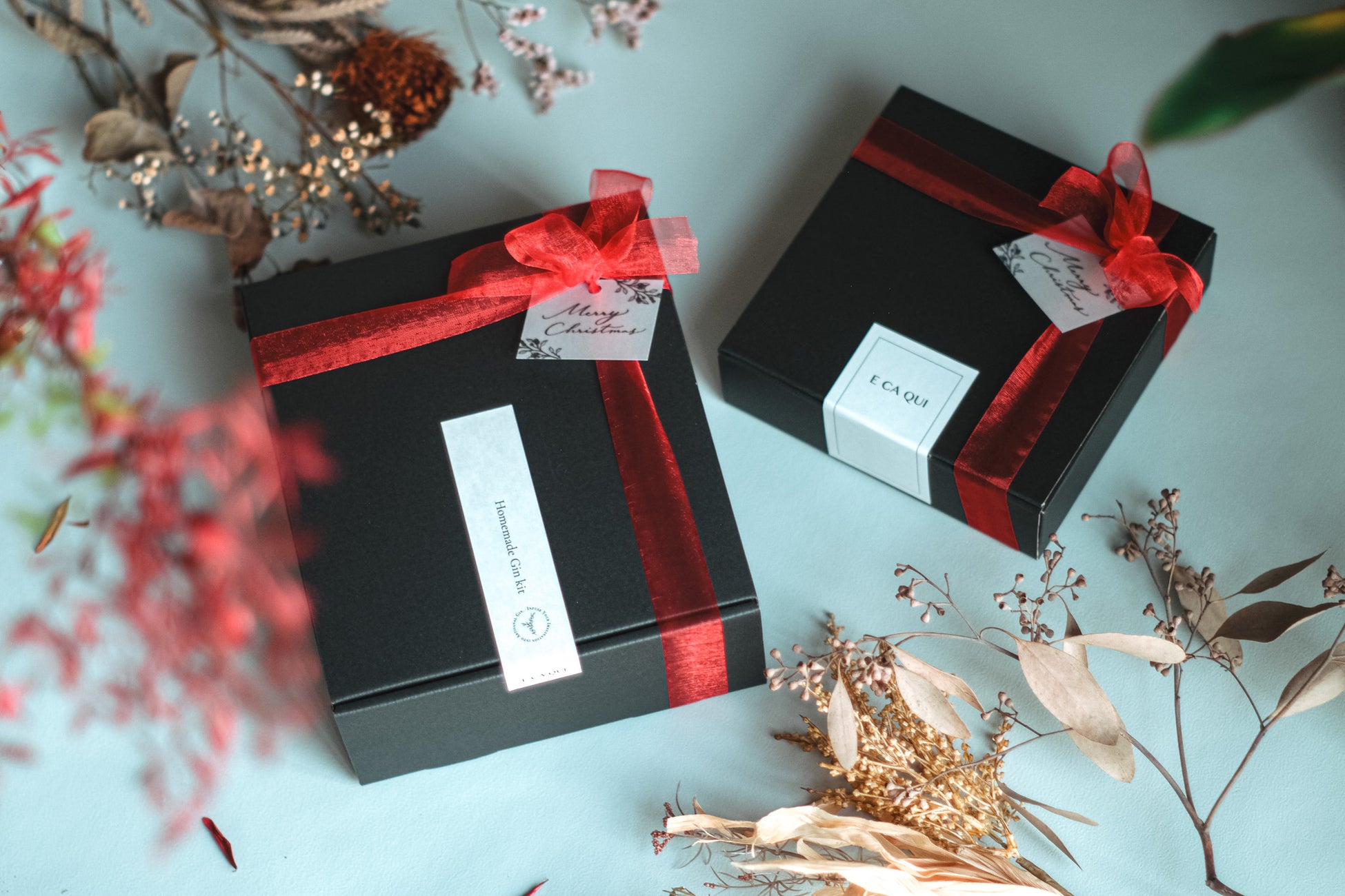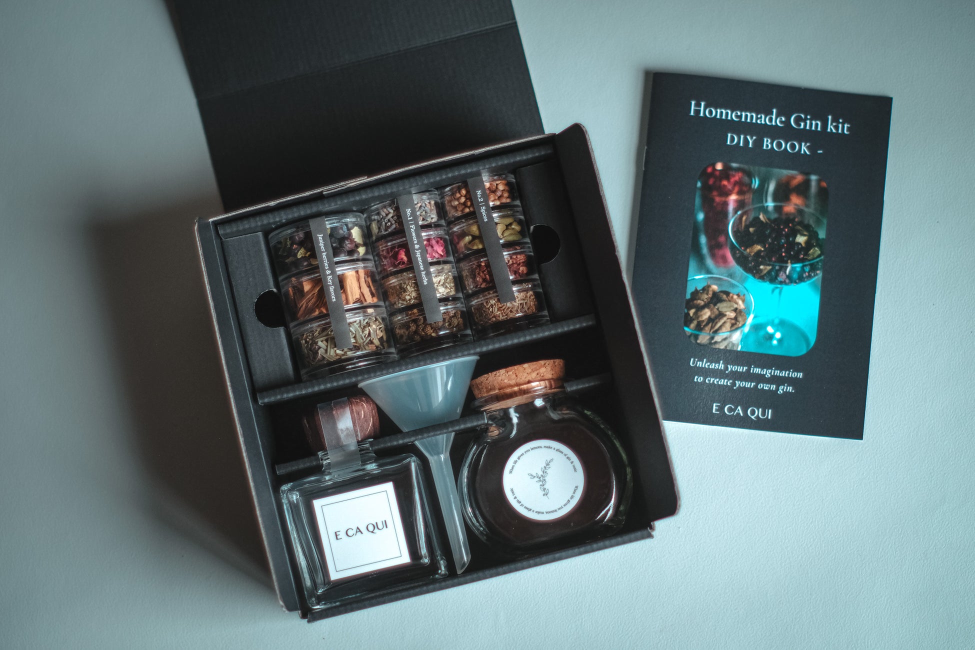 E CA QUIのシグネチャーアイテムである「Homemade Gin kit」は、自宅で手軽にオリジナルジンを作ることができるキットです。このホリデーシーズンには、クリスマス限定の華やかなラッピングをご用意いたしました。黒のパッケージに、深紅のオーガンジーリボンとメッセージでクリスマスの特別な雰囲気を演出します。大切な人へ、オリジナルジン作りを楽しむひとときをプレゼントしてみてはいかがでしょうか。