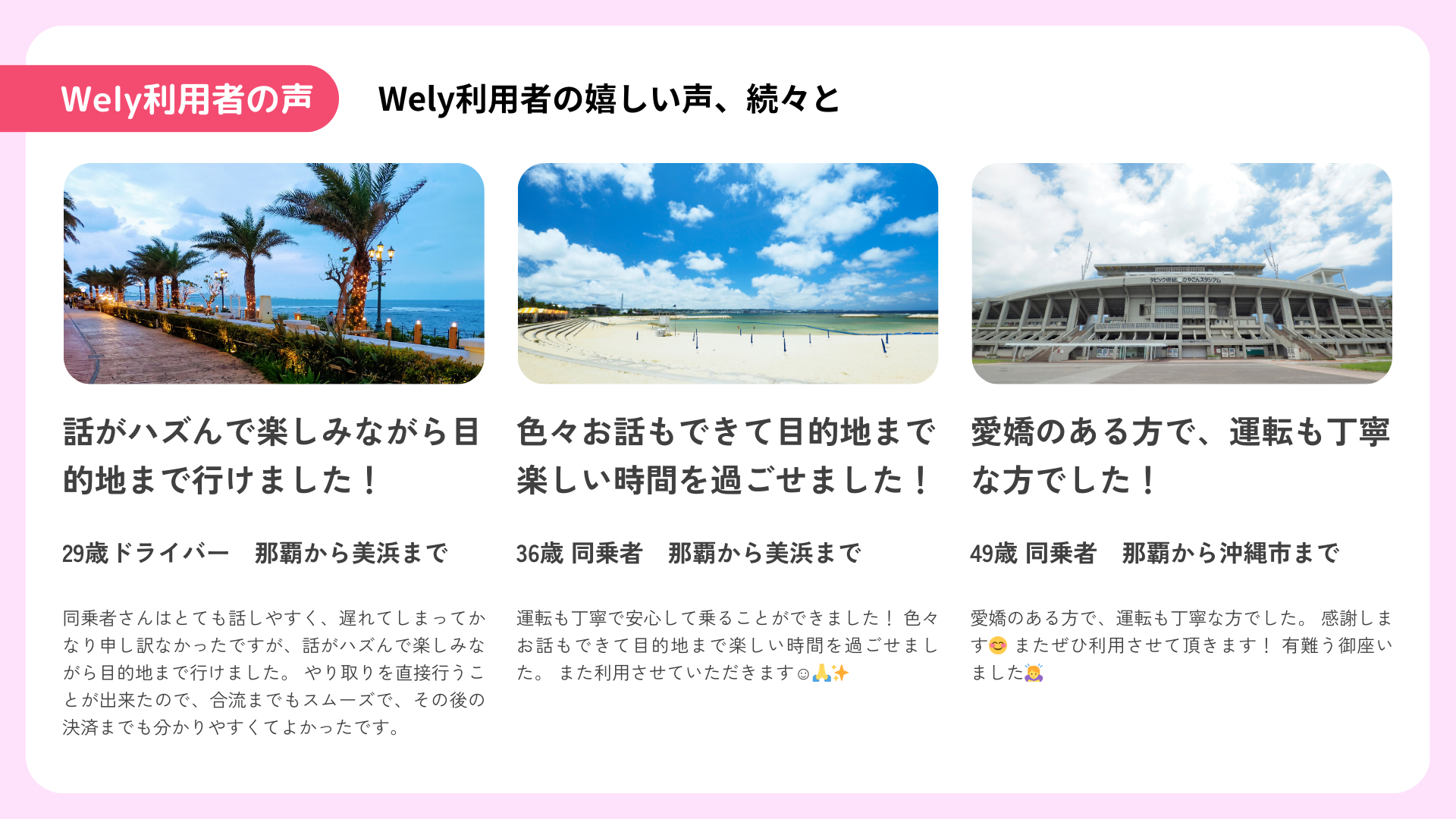 株式会社オキジモの子会社である、WaysLink株式会社(本社:沖縄県南風原町宮平、代表者:上地 佑来)は、女性専用ライドシェアサービス『Wely』の実証実験を行います。