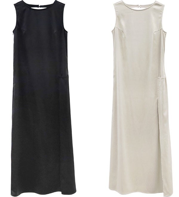 バックデザインブラが美しくに見えるデザイン。シワになりにくく、ボディラインを拾いすぎないスリット入りのサテンドレス。