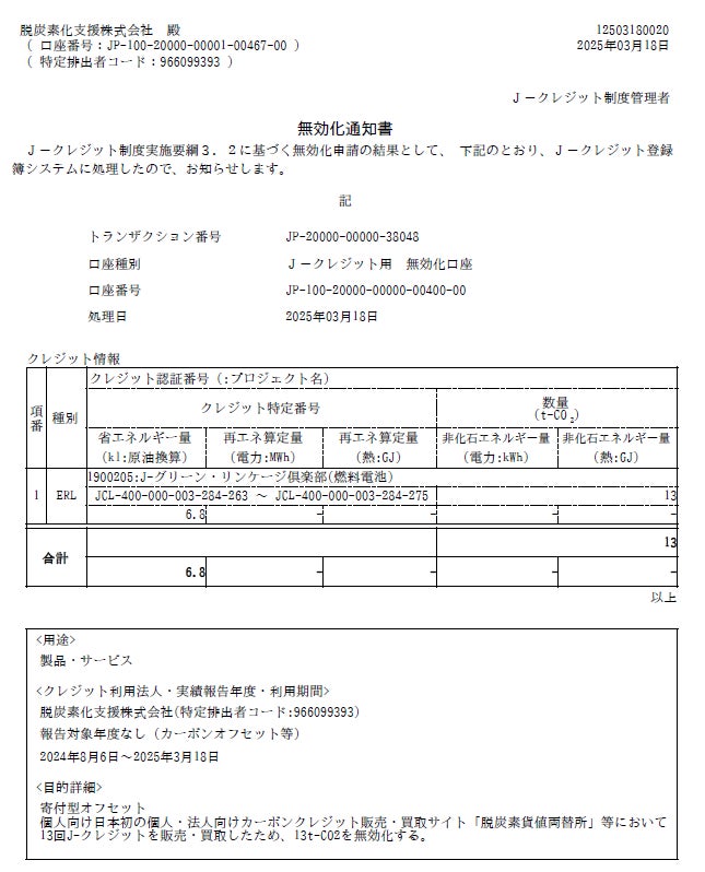 2025年3月18日に販売・買取1回あたり「J-クレジット」1t-CO2、13回分、13t-CO2(累計32t-CO2)を脱炭素化支援株式会社の費用負担により日本政府運営の「J-クレジット」登録簿システムにおいて無効化を実施し、脱炭素社会の実現へ貢献しました。