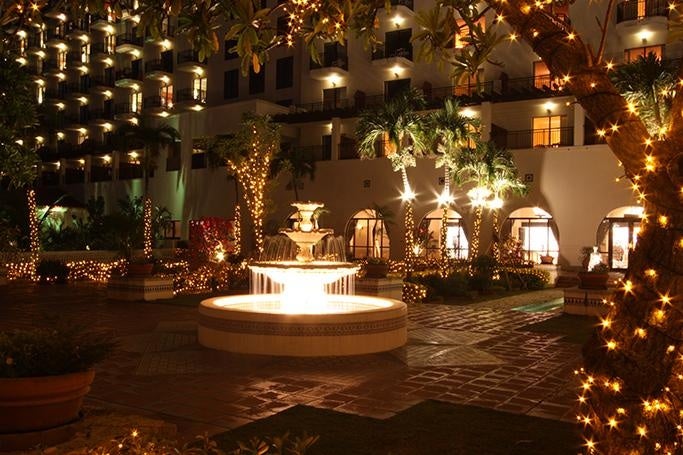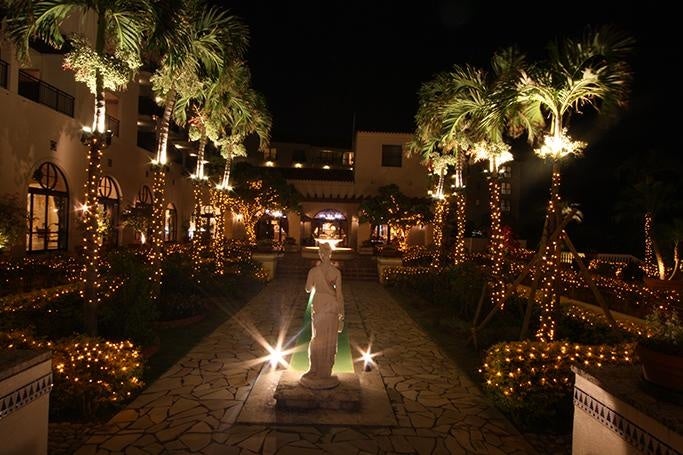 アリビラを彩る人気のイルミネーション。LED電球のイルミネーションやライトアップでホテルのパティオ(中庭)やプールサイド、エントランスを彩ります。キャンドルカラーに煌めくあたたかい光の中、リゾートナイトのロマンチックな散歩をお楽しみください。