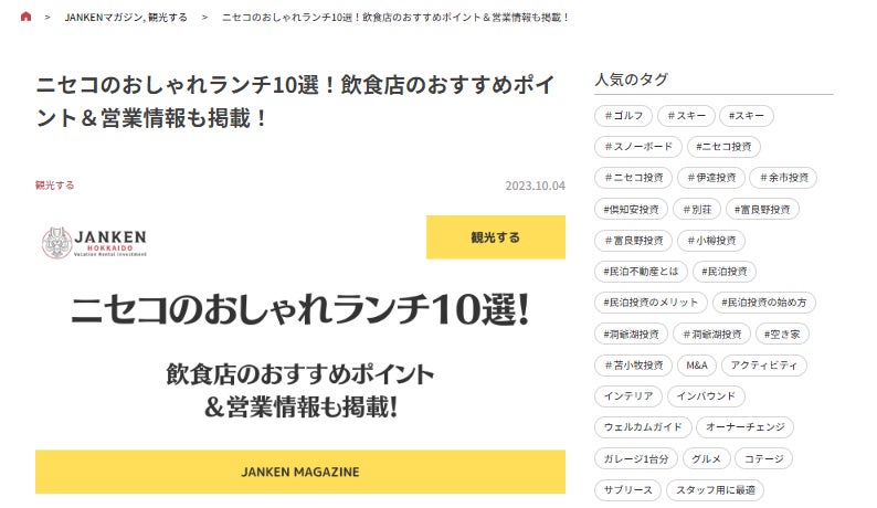 【観光軸】での具体的な施策としては、既に「JANKENマガジン」でも取り組まれていましたが、北海道の各地域(特に、当社が長く関わっているニセコ・富良野・札幌エリアを中心に)の魅力的なお店・商品・サービスを、Web上の記事コンテンツとして紹介していきます。