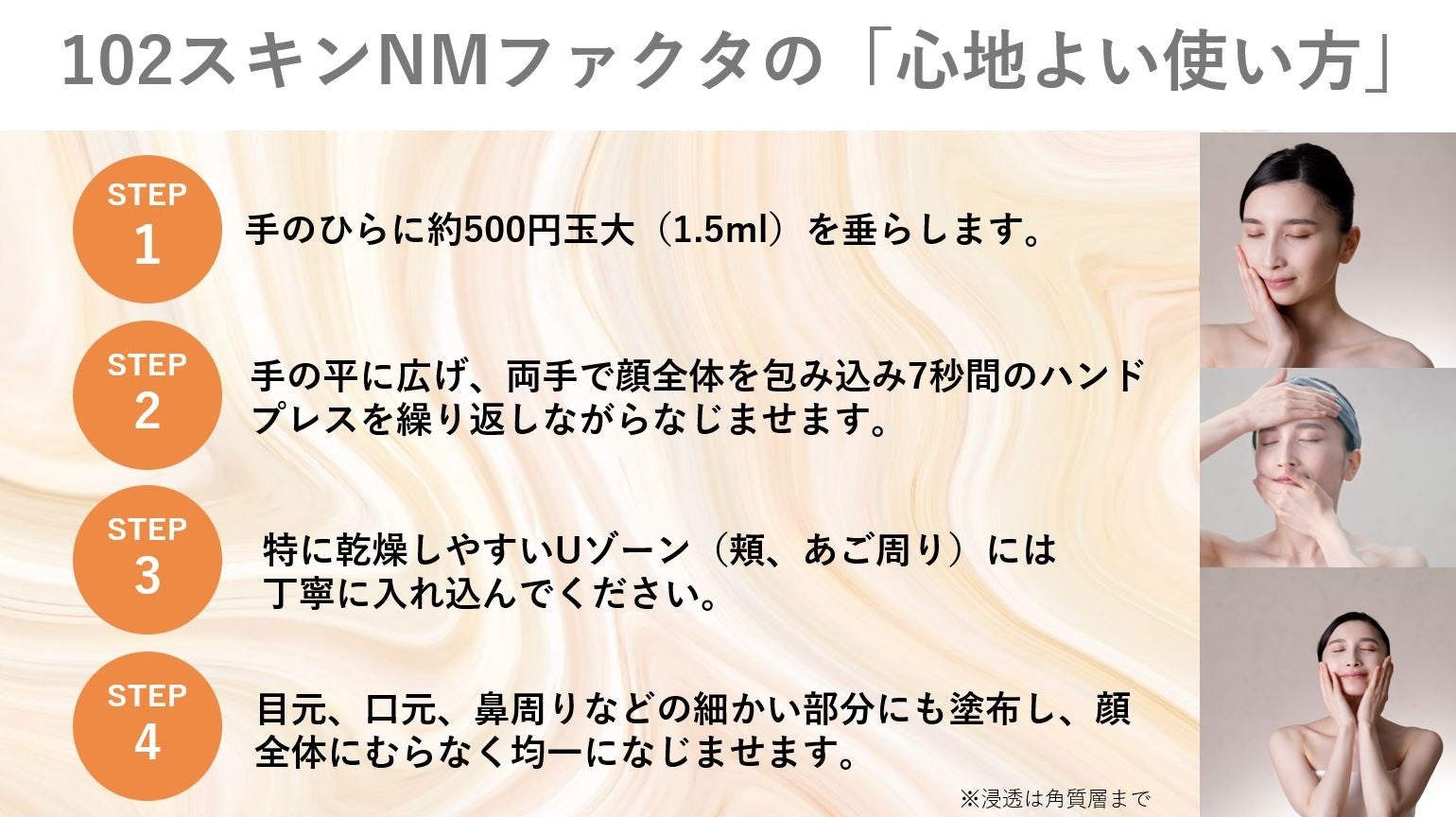 ローション状美容液の102スキンNMファクタは、特に天然保湿因子に着目した美容液です。私たちはこの美容液の開発において、テクスチャー、水と油のバランス、浸透性*²、伸びにこだわり、何度も試行錯誤を繰り返し、理想的な水と油の絶妙なバランスを持つテクスチャーを実現しました。