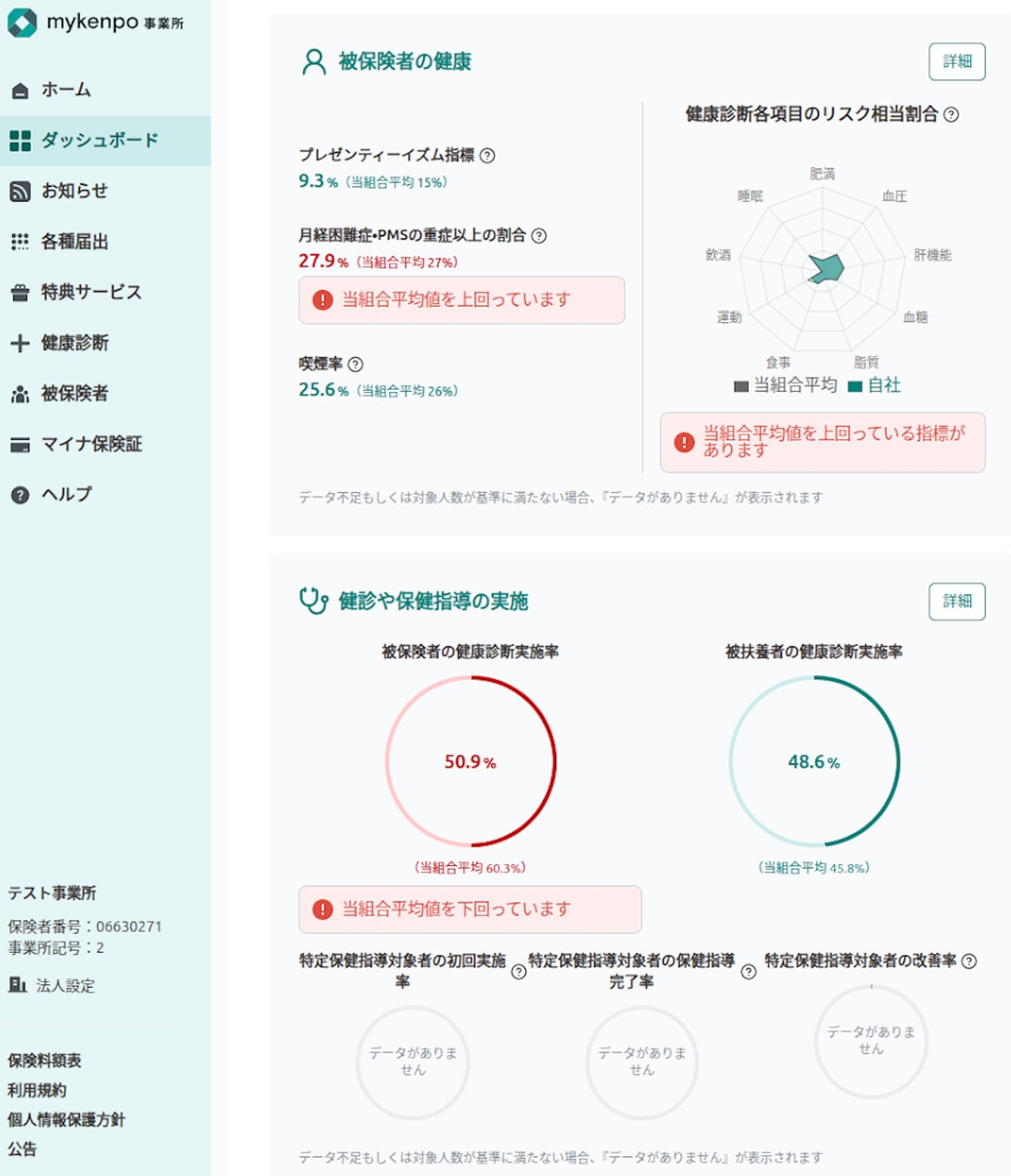 また、2025年12月11日には、加入事業所向けのポータルサイトmykenpo上で、事業所内の健康状況を相対的に現状把握できる「ダッシュボード」機能をリリースしました。mykenpoの「ダッシュボード」では、健診結果や適用データ等から組合内平均と自社平均の数値を比較することが可能です。スタートアップにおける健康経営のはじめの一歩として、社内の健康状態・健康課題の把握を支援します。
