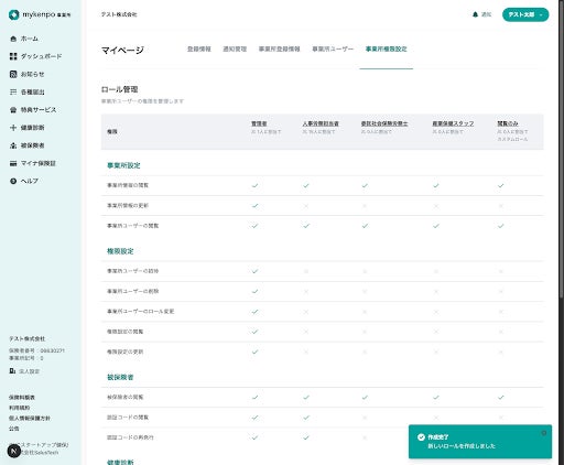 また、今回の「ダッシュボード」機能リリースに伴い、mykenpo事業所ユーザーの権限設定をより詳細に設定できるようになりました。標準で用意された4種類のロールに加えて、事業所独自のカスタムロールを作成できるようになり、より柔軟な権限管理が可能になります。