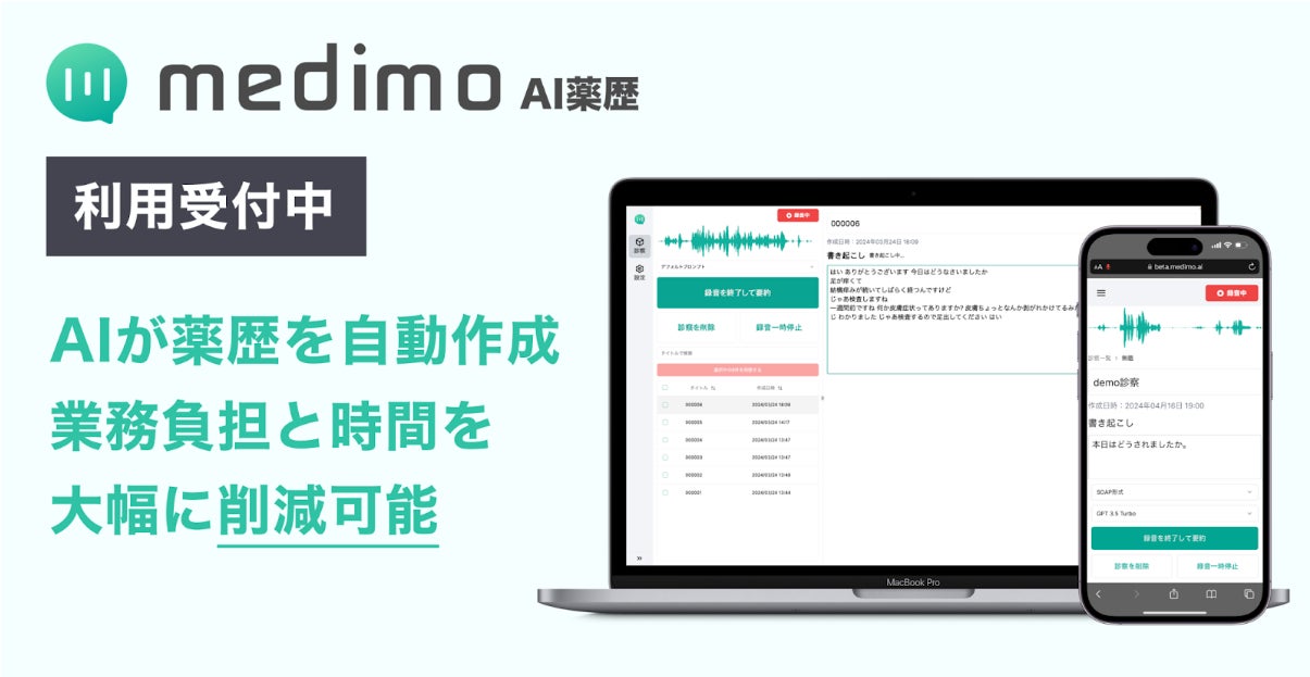 株式会社Pleap(本社:東京都世田谷区、代表取締役:野村 怜太郎・中原 楊・馬 劭昂、以下「当社」)は、「medimo AI薬歴」の提供を本日(2025年1月22日)より開始いたします。薬歴などの書類作成作業にかかる時間を生成AIによって大幅に削減することで、薬剤師の業務負担を減らし、より深く患者さんに向き合える環境の実現に貢献します。