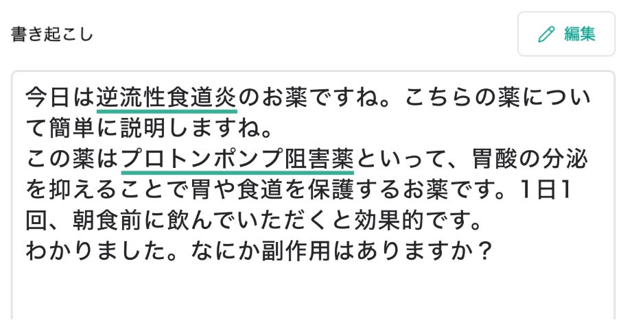 書き起こされたやりとりを元に、AIが迅速に要約を作成します。薬歴に多用されるSOAP形式だけでなく、希望の要約形式となるようにAIをオーダーメイドして調整いたします。