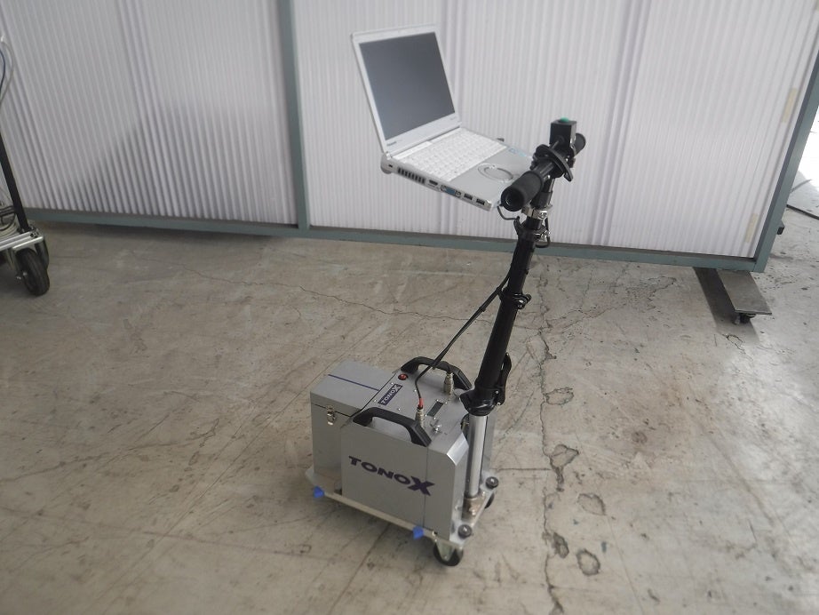 また、総重量約20kg折り畳み可能、簡易に持ち運べる利便性を兼ねております。測定した結果は、手元搭載のPCにより即座に確認可能。スピーディに現物確認ができます。1回の計測で約2.5kmの長距離計測を可能にしました。バッテリーは小型化リチウムイオンで5時間以上の長時間の計測も可能です。バッテリーは脱着式になっている為、充電も楽です。