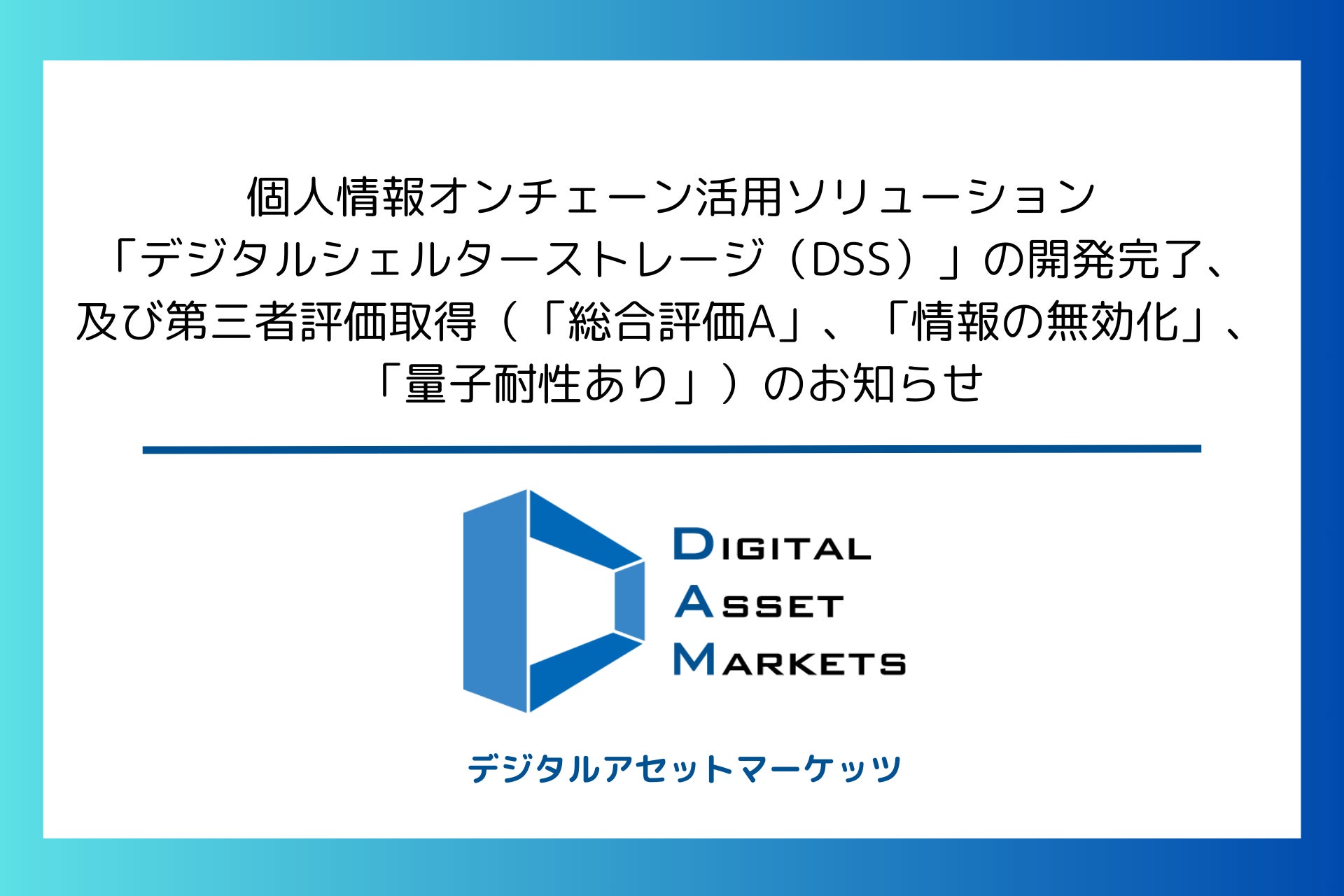 株式会社デジタルアセットマーケッツ(本社:東京都千代田区、代表取締役:西本一也、 以下「デジタルアセットマーケッツ」)は、個人情報オンチェーン活用ソリューション「デジタルシェルターストレージ(DSS)」を開発しました。DSSは設定次第で個人情報を無効化し、ブロックチェーンを活用した暗号分散環境で取扱いできる機能を実装し、同環境でスマートコントラクトやオープン型AIで情報処理を行うことができるデータマネジメントプラットフォーム(DMP)です。
