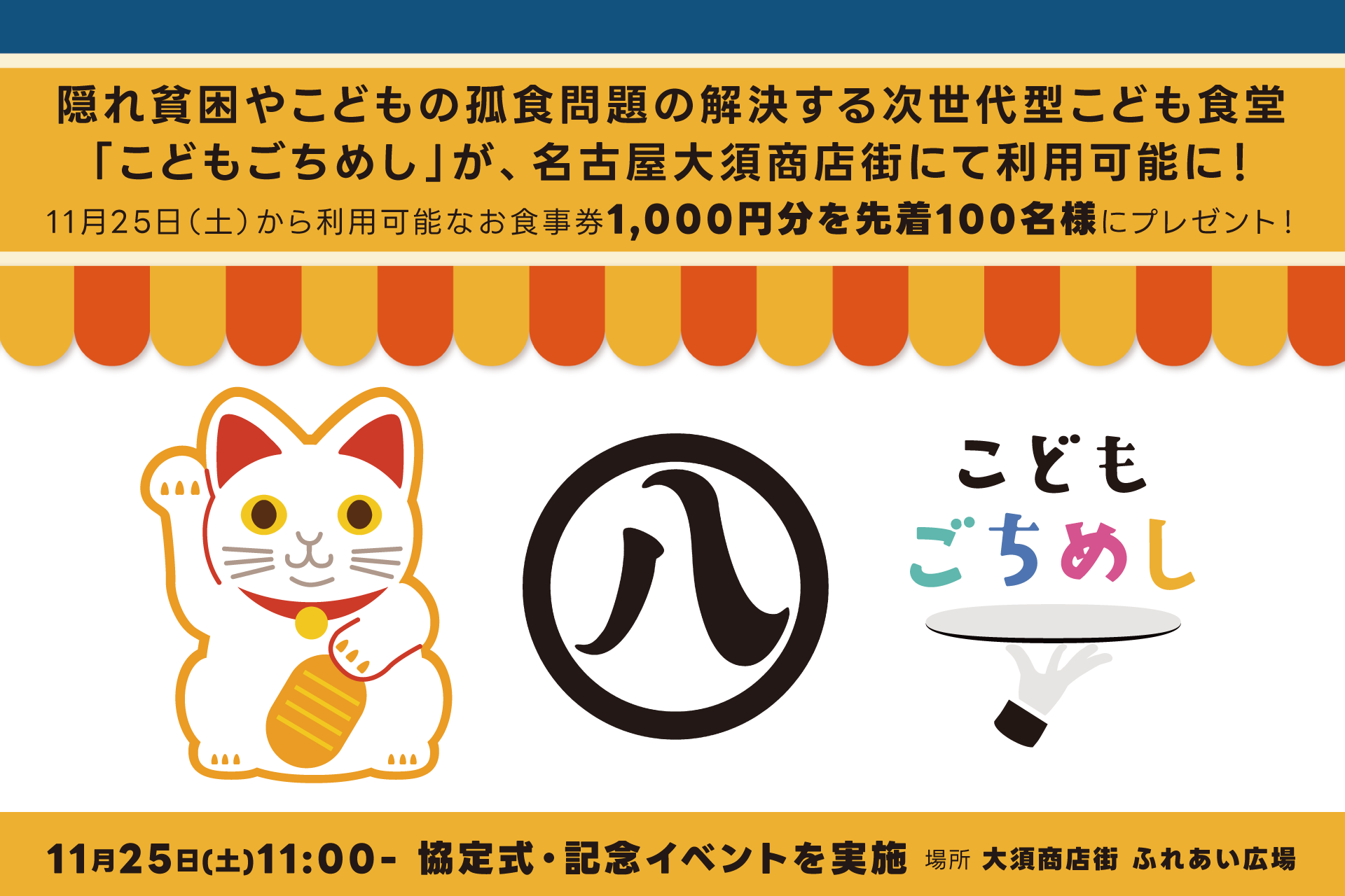 名古屋市とNPO法人Kids Future Passportは、子どもの貧困対策に関する協定を締結し、11月25日(土)11時より名古屋市との協定式と、こどもごちめしイベントを開催