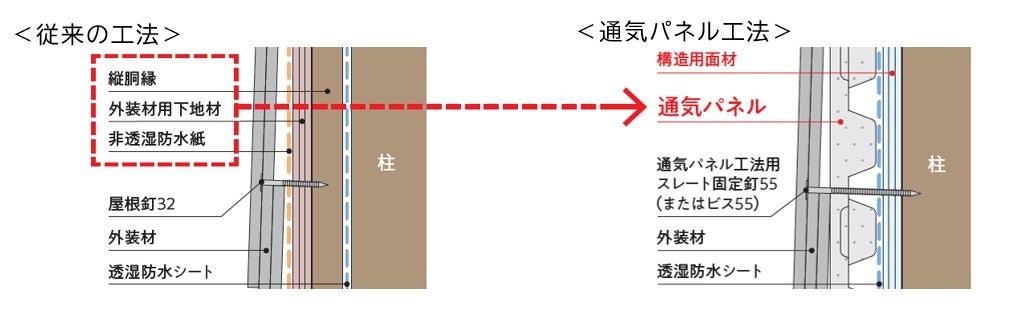 KMEW通気パネルを使用した工法では、パネル一枚で下地を構成し、通気を確保できます。この工法は従来の工法に比べて部材点数を削減できるため、省施工や材工価格低減、さらには建物の軽量化を実現します。これにより、職人不足や高齢化などの社会問題の解決に寄与します。