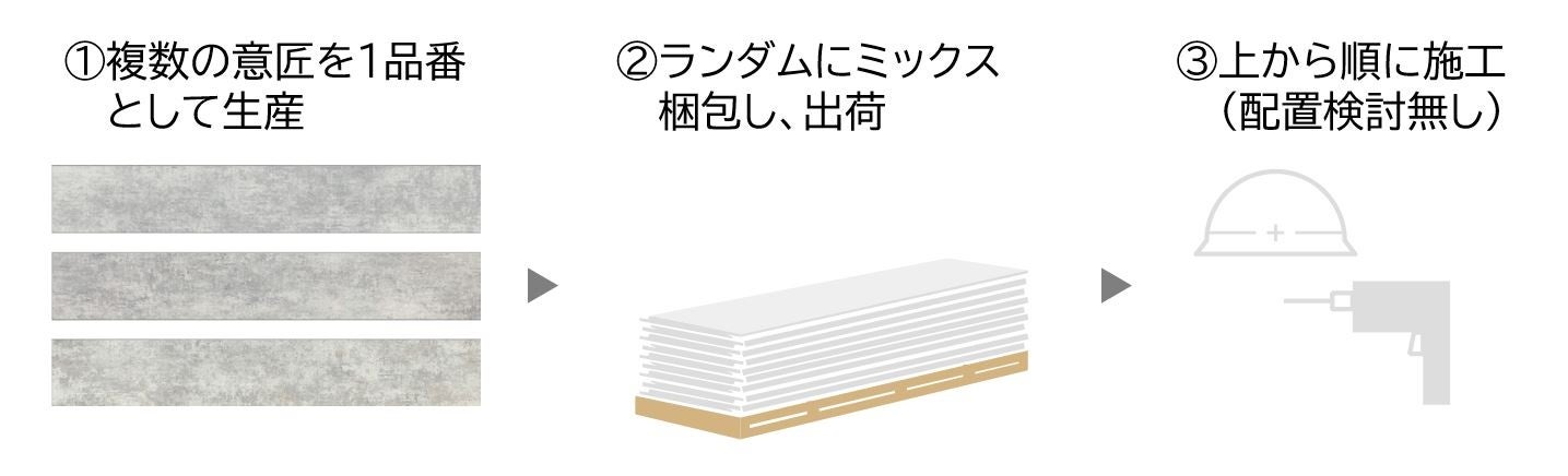 従来のサイディングは、1品番につき単一の意匠であるため、壁面のデザインが単調になりがちでした。そこで「グラフィル」は複数の意匠を1品番として生産し、ランダムにミックス梱包する