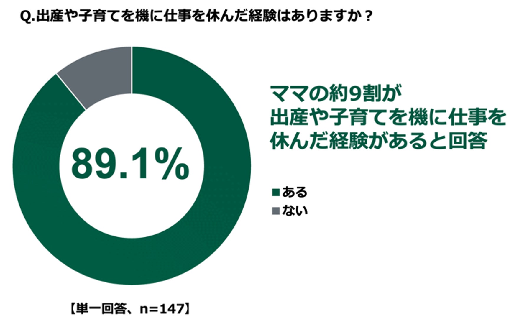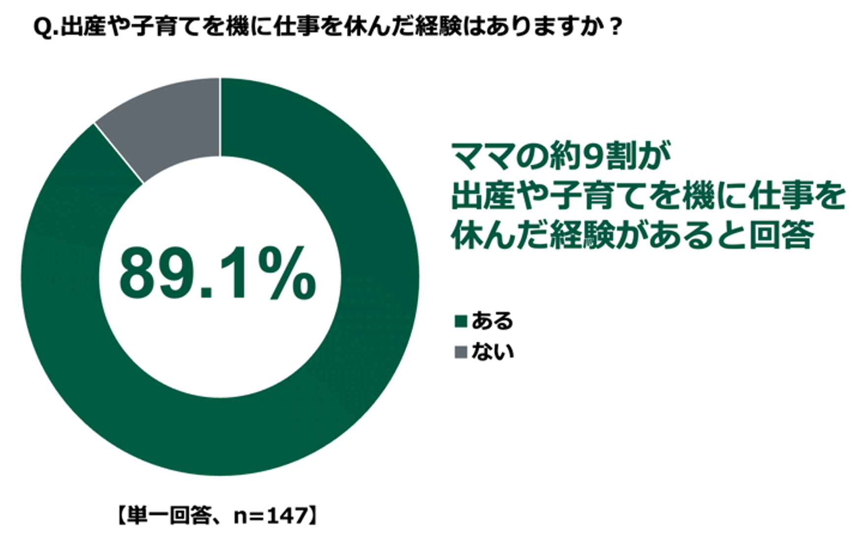 約9割(89.1%)のママが出産や子育てを機に仕事を休んだ経験があると回答。また、休職経験があるママの半数以上(58.0%)がキャリアを継続したかったと感じている結果に