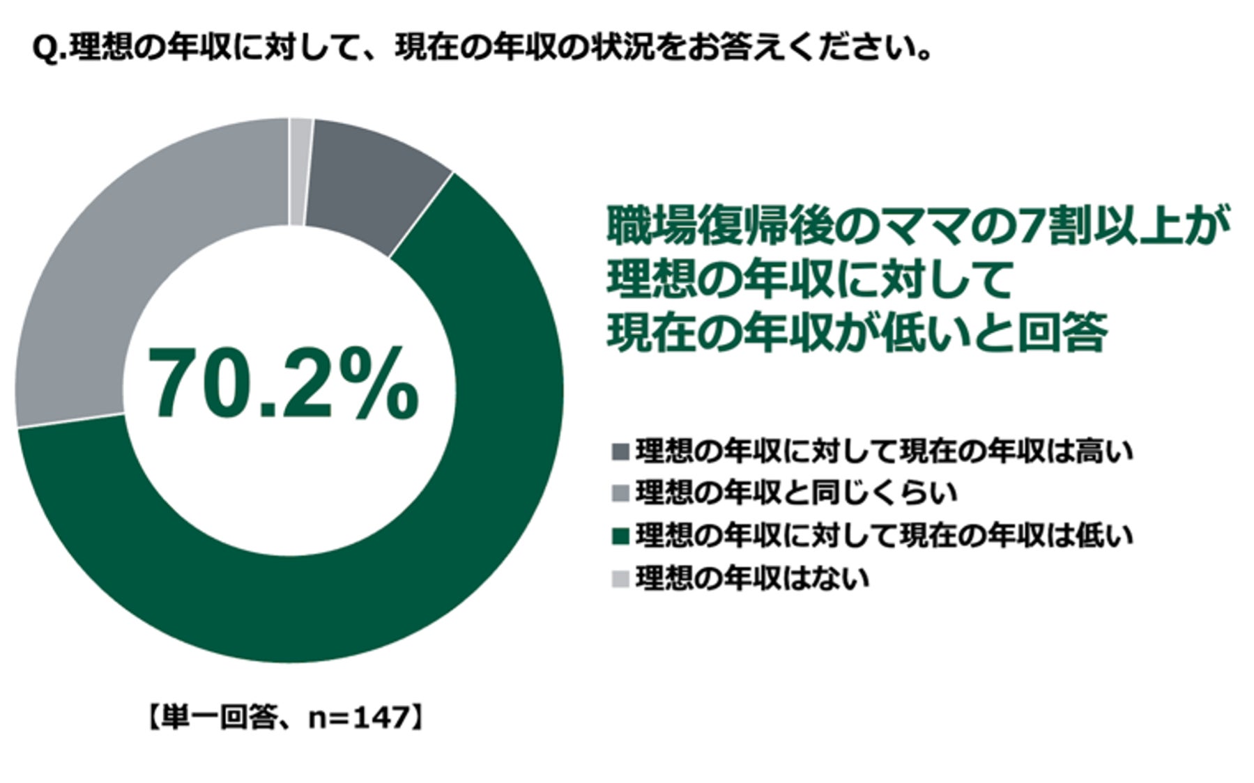 職場復帰後のママに対して、理想の年収に対して現在の年収の状況を聞くと、全体の7割以上となる70.2%が「理想の年収に対して現在の年収が低い」と回答しました。
