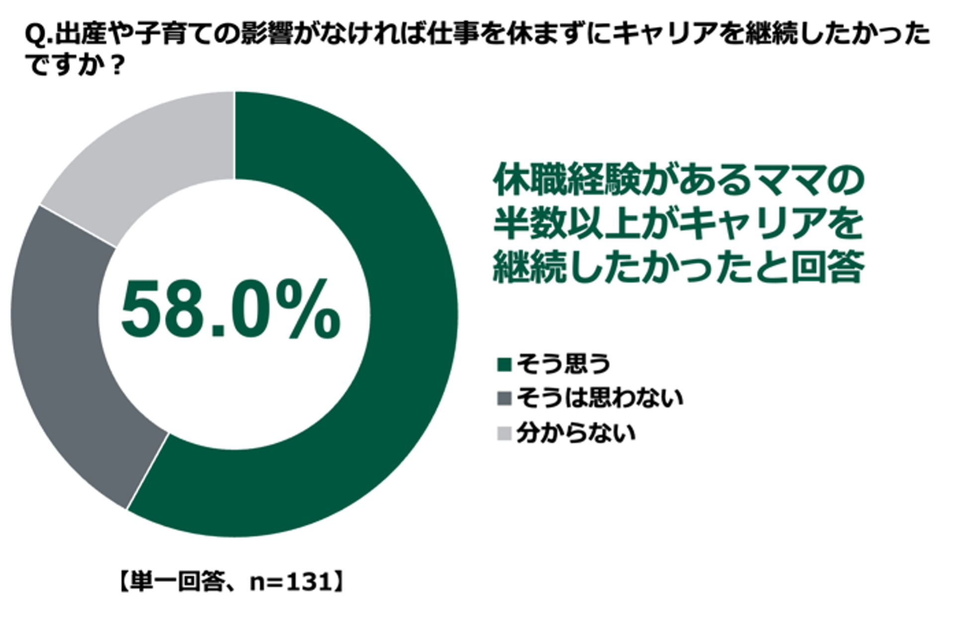 出産や子育てを機に仕事を休んだ経験があると回答したママの半数以上となる(58.0%)は「キャリアを継続したかった」と回答。女性のキャリア構築に対する意欲の高さが明らかとなりました。