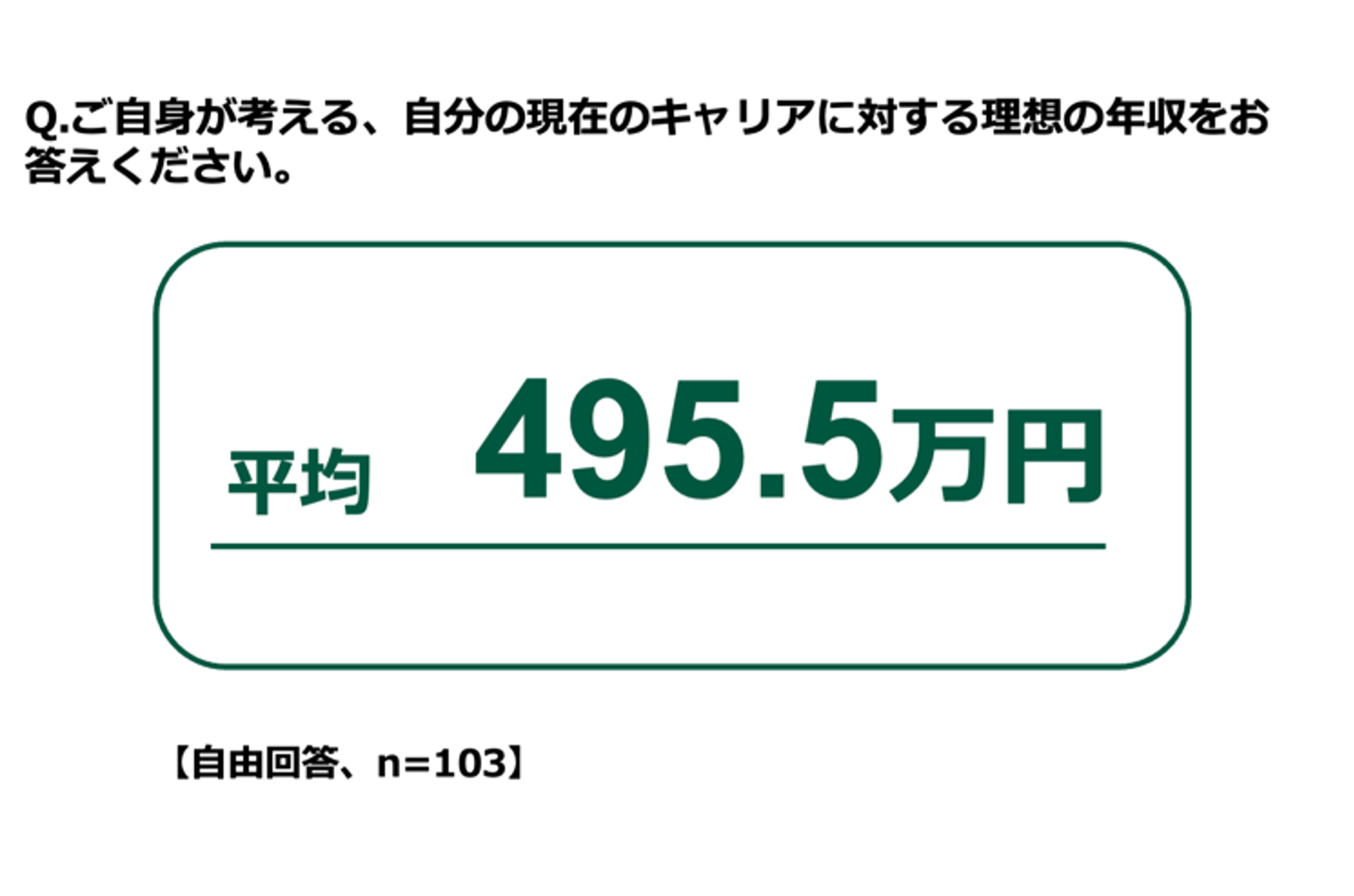 職場復帰後のママに対して、自身が考える自分の現在のキャリアに対する理想の年収を聞くと、「平均495.5万円」という結果となりました。また、最大1,500万円を望むママもいるなど、「リキャリア」に対する高い意欲が見受けられます。