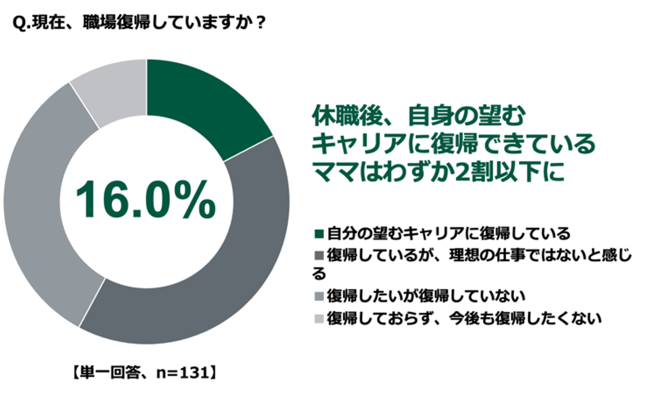 また、休職後、自身の望むキャリアに復帰できているママはわずか2割以下(15.2%)となり、さらに、仕事に復帰したいが復帰できていないママが約3割(30.5%)いるという結果に。調査結果から、出産や子育てという大きなイベント後のキャリアの復帰(リキャリア)において、十分な環境が整っていないことがうかがえます。