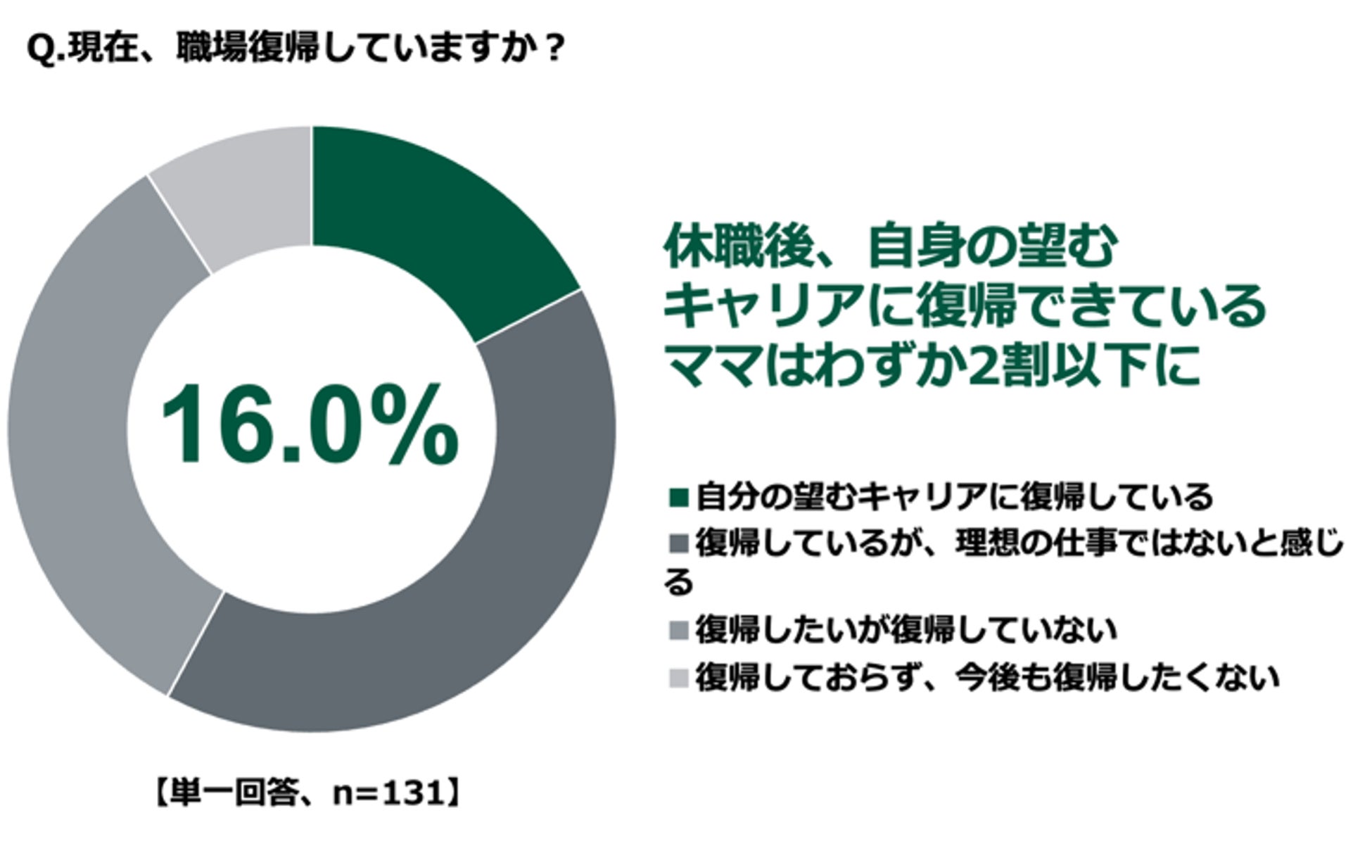 休職後、自身の望むキャリアに復帰できているママはわずか2割以下(15.2%)。さらに、約3割(30.5%)は仕事に復帰したいが復帰できていない結果に