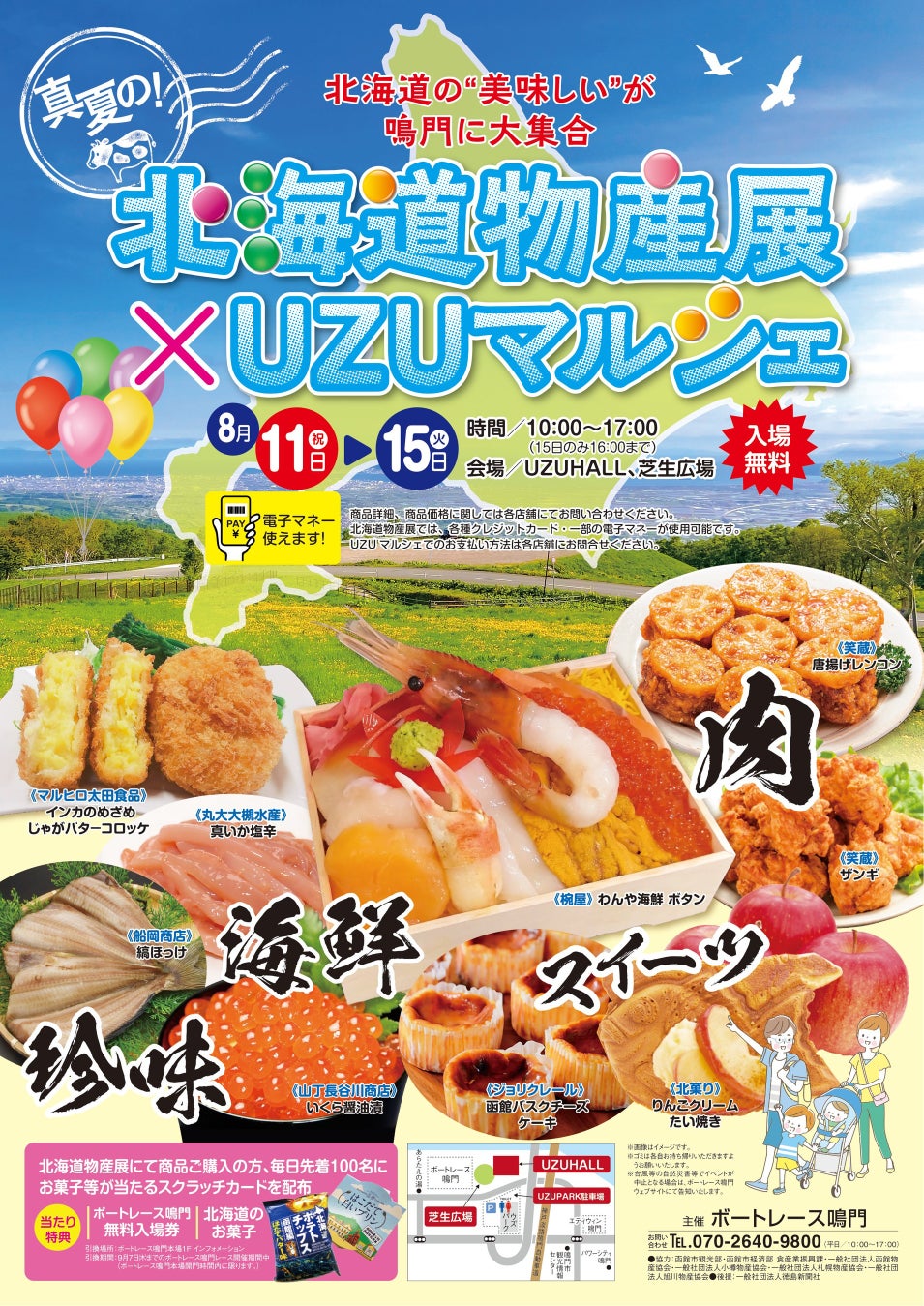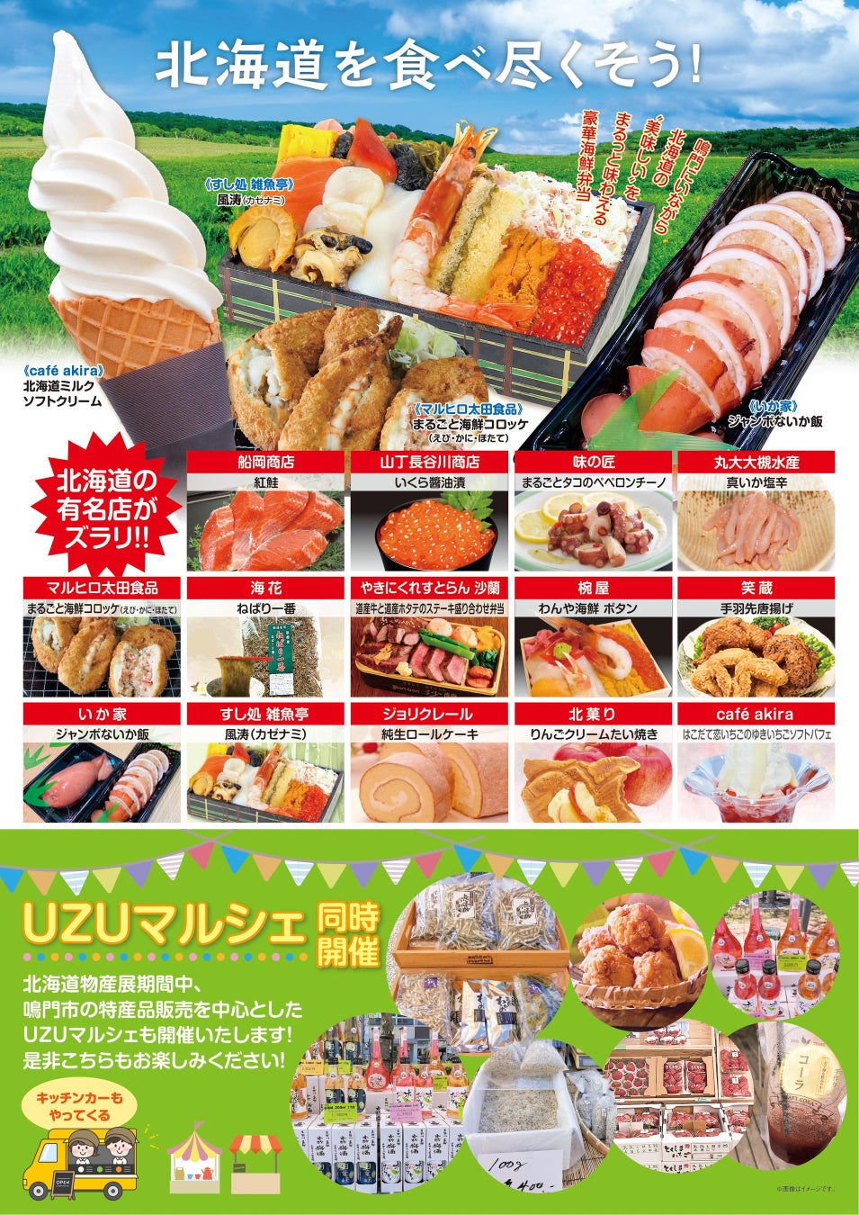 8月11日~15日、鳴門市在住の方だけでなく、帰省されている方や旅行客など多くの方が楽しめるグルメイベントとして「真夏の!北海道物産展×UZUマルシェ」を開催します!