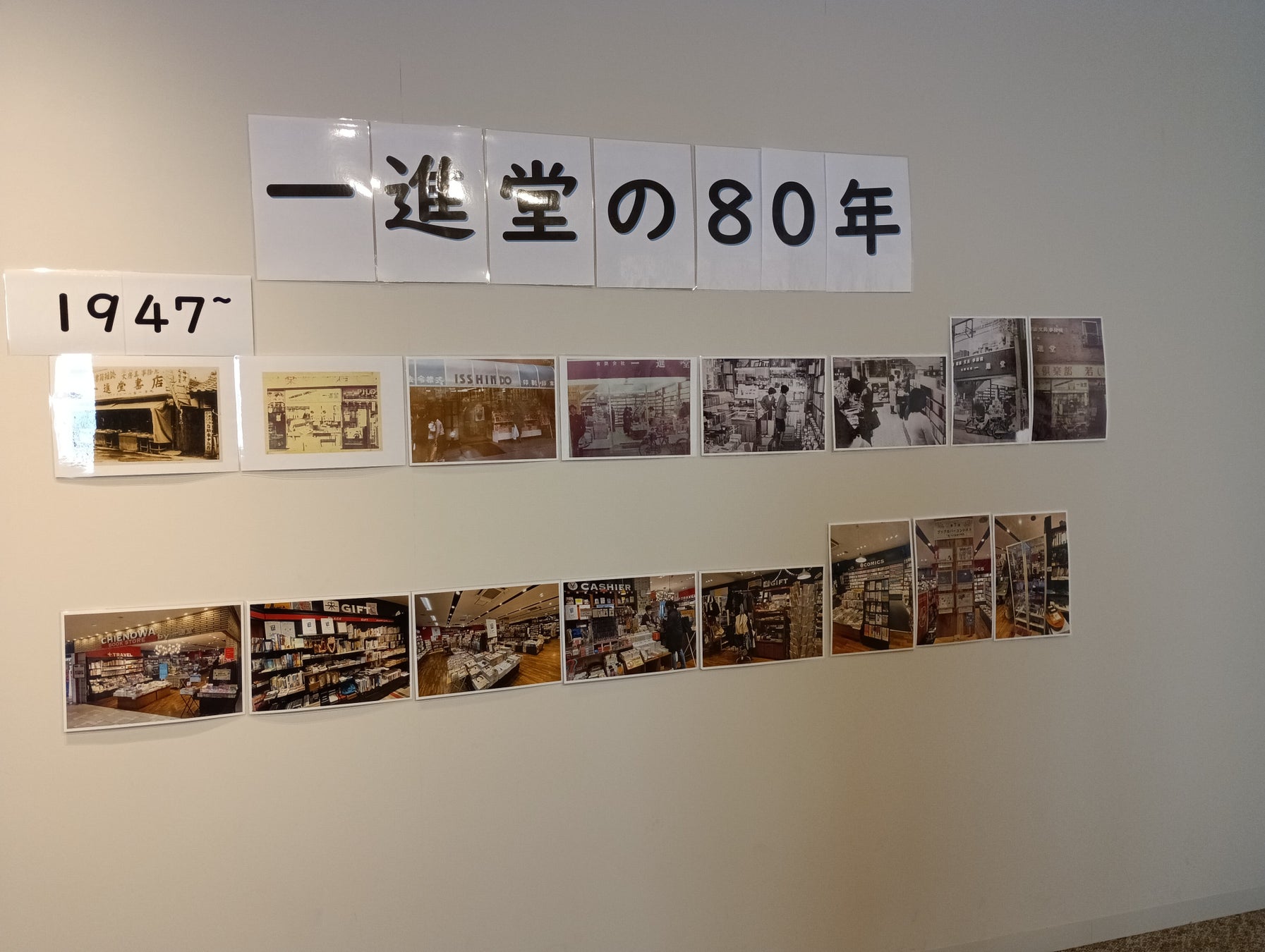 店内2階ギャラリーには今、「一進堂の80年」と題した写真展示コーナーがあります。戦後間もない頃の小さな本屋から始まり、時代とともに変わっていく店の姿が、一枚一枚の写真に刻まれています。