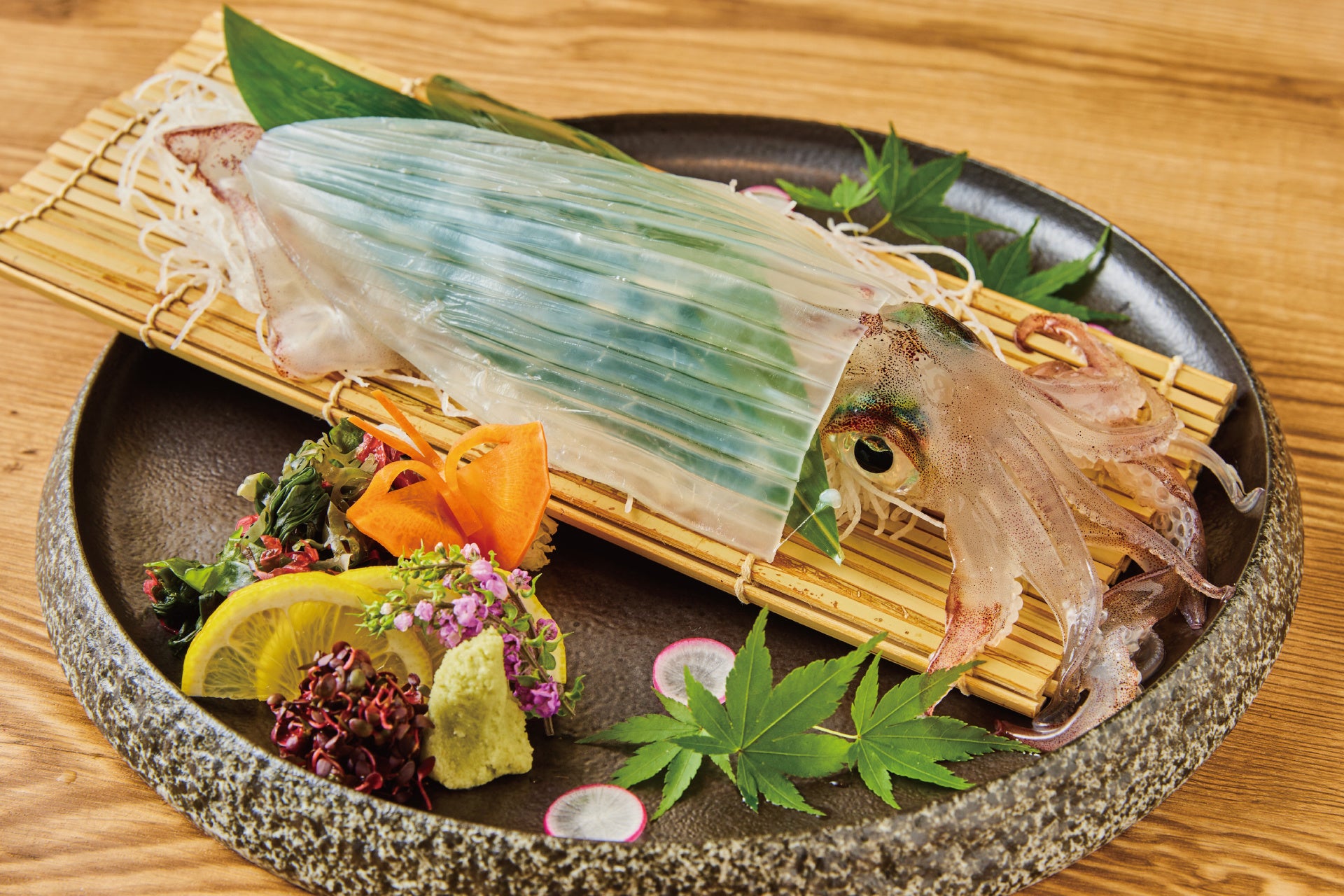 生け簀に泳いでいるイカをオーダーの際に釣り上げ、手早くさばいて提供するイカの活き造りが和たつ美の名物です。活魚の新鮮さと、透き通るような身、コリコリとした食感と甘みがたまらない一品です。