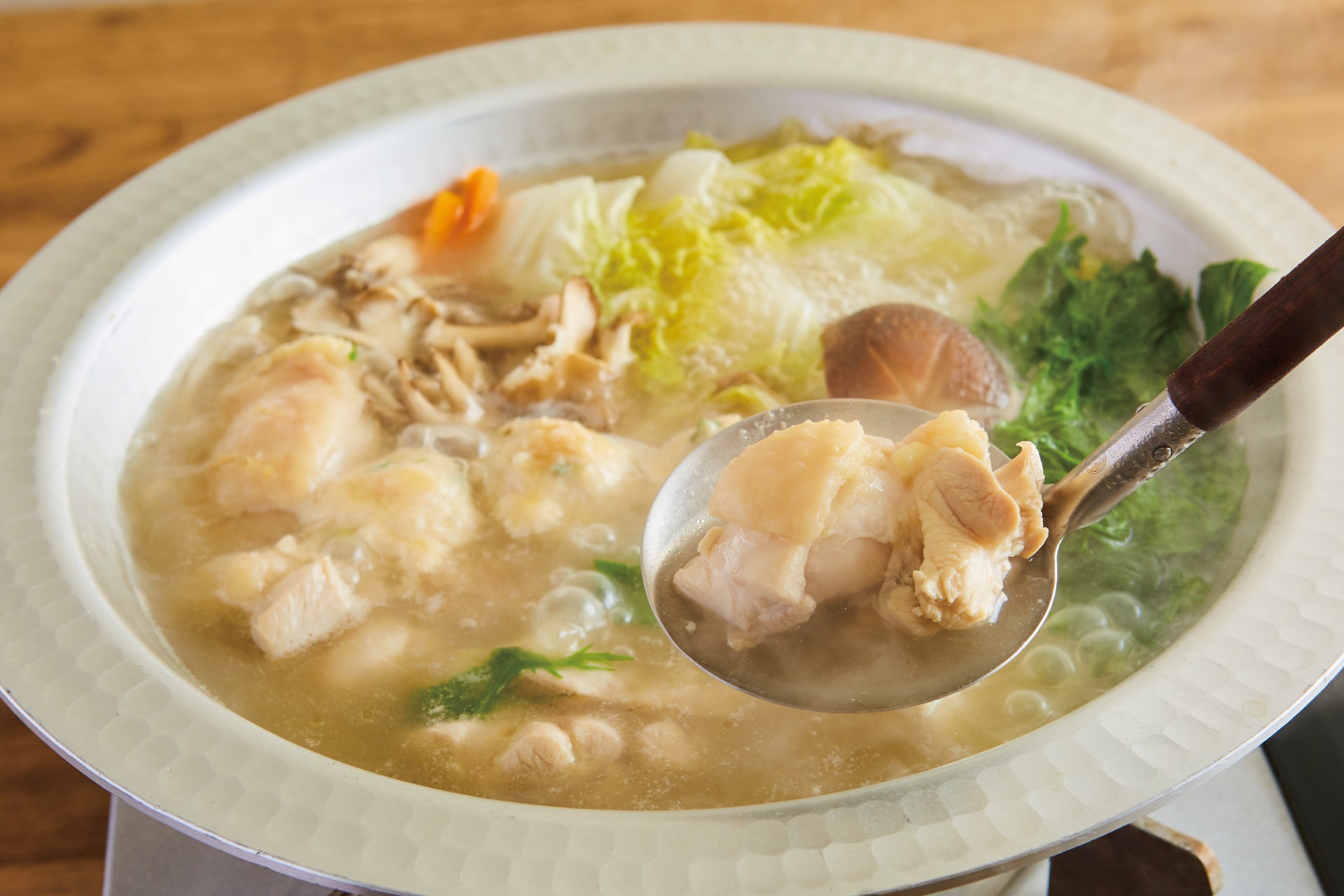 鶏をじっくり煮込み、長時間かけて丁寧に旨味を引き出すことで、天然コラーゲンが豊富な、健康と美容に優れているスープに仕上げました。栄養分がしっかりと溶け込んだ、濃厚且つ上品な味わいが自慢の特製水炊きスープをお楽しみください。