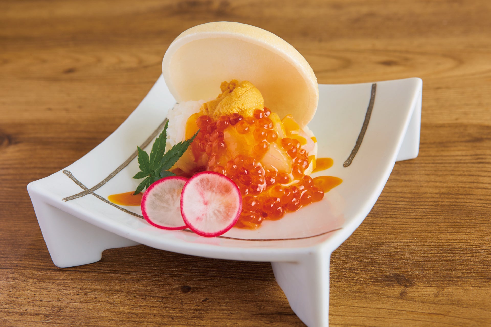 自慢の鮮魚にいくらと雲丹を加え、最中の皮で包んだ逸品です。