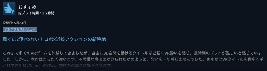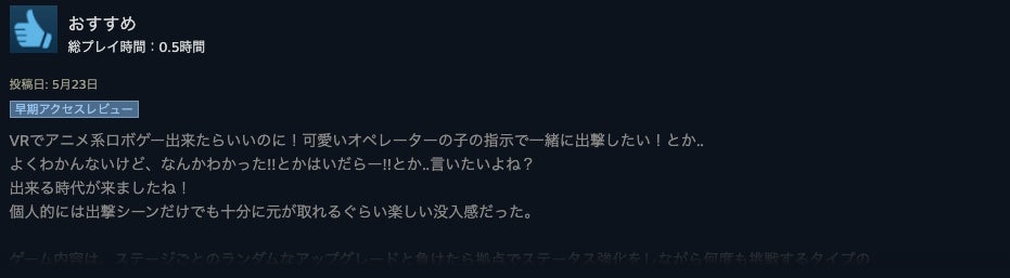 総じて、本作はVRアクションゲームとして非常に完成度が高く、今後のアップデートにも大いに期待が持てます。VR市場はまだ規模が小さいとはいえ、この作品のクオリティであれば、もっと注目されてもいいはず。ロボットアクションが好きな方、VR酔いに悩んでいた方には、ぜひプレイしてもらいたい一作です。