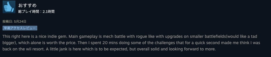これはまさに素晴らしいインディーの名作です。メインのゲームプレイはメックバトルにローグライク要素とアップグレードが組み合わさっており、小規模な戦場(もう少し広ければなお良し)での戦いが中心で、それだけでも価格に見合う価値があります。それからチャレンジモードを20分ほどプレイしましたが、一瞬Wiiスポーツリゾートに戻ったような気分になりました。多少の粗さはありますが、これは予想通りで、全体的には完成度が高く、今後の展開が楽しみです。