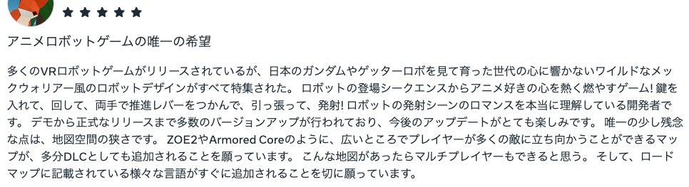 多くのVRロボットゲームがリリースされているが、日本のガンダムやゲッターロボを見て育った世代の心に響かないワイルドなメックウォリアー風のロボットデザインがすべて特集された。 ロボットの登場シークエンスからアニメ好きの心を熱く燃やすゲーム! 鍵を入れて、回して、両手で推進レバーをつかんで、引っ張って、発射! ロボットの発射シーンのロマンスを本当に理解している開発者です。 デモから正式なリリースまで多数のバージョンアップが行われており、今後のアップデートがとても楽しみです。 唯一の少し残念な点は、地図空間の狭さです。 ZOE2やArmored Coreのように、広いところでプレイヤーが多くの敵に立ち向かうことができるマップが、多分DLCとしても追加されることを願っています。 こんな地図があったらマルチプレイヤーもできると思う。 そして、ロードマップに記載されている様々な言語がすぐに追加されることを切に願っています。
