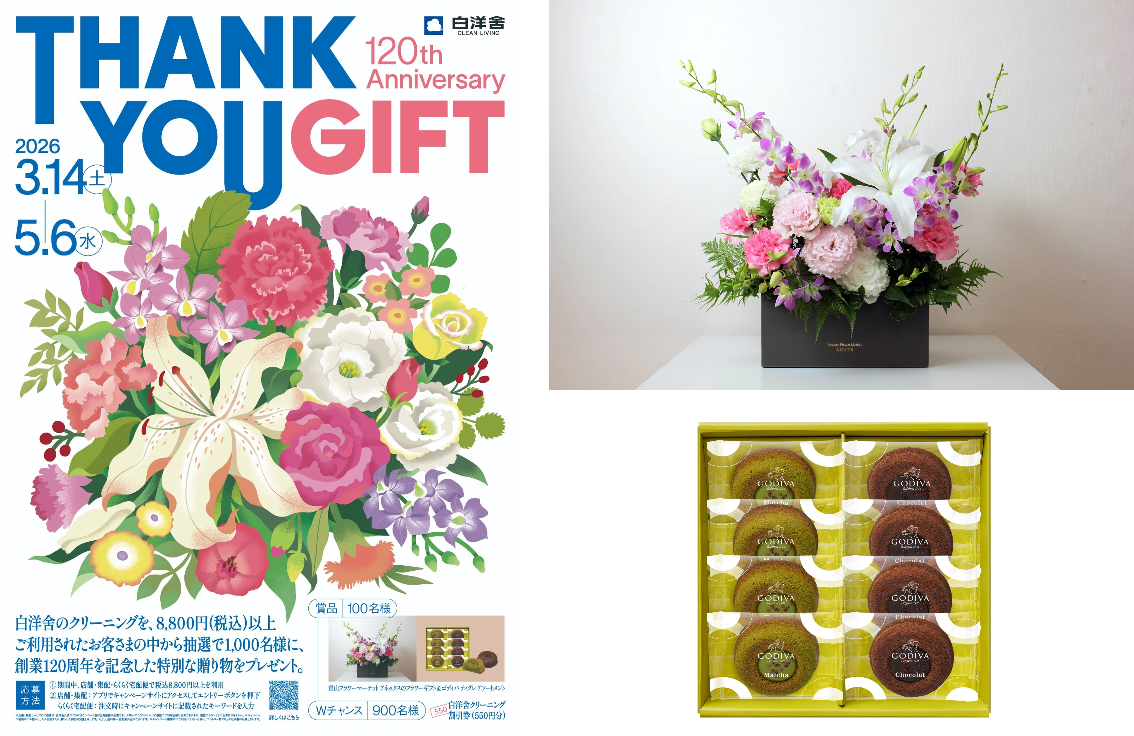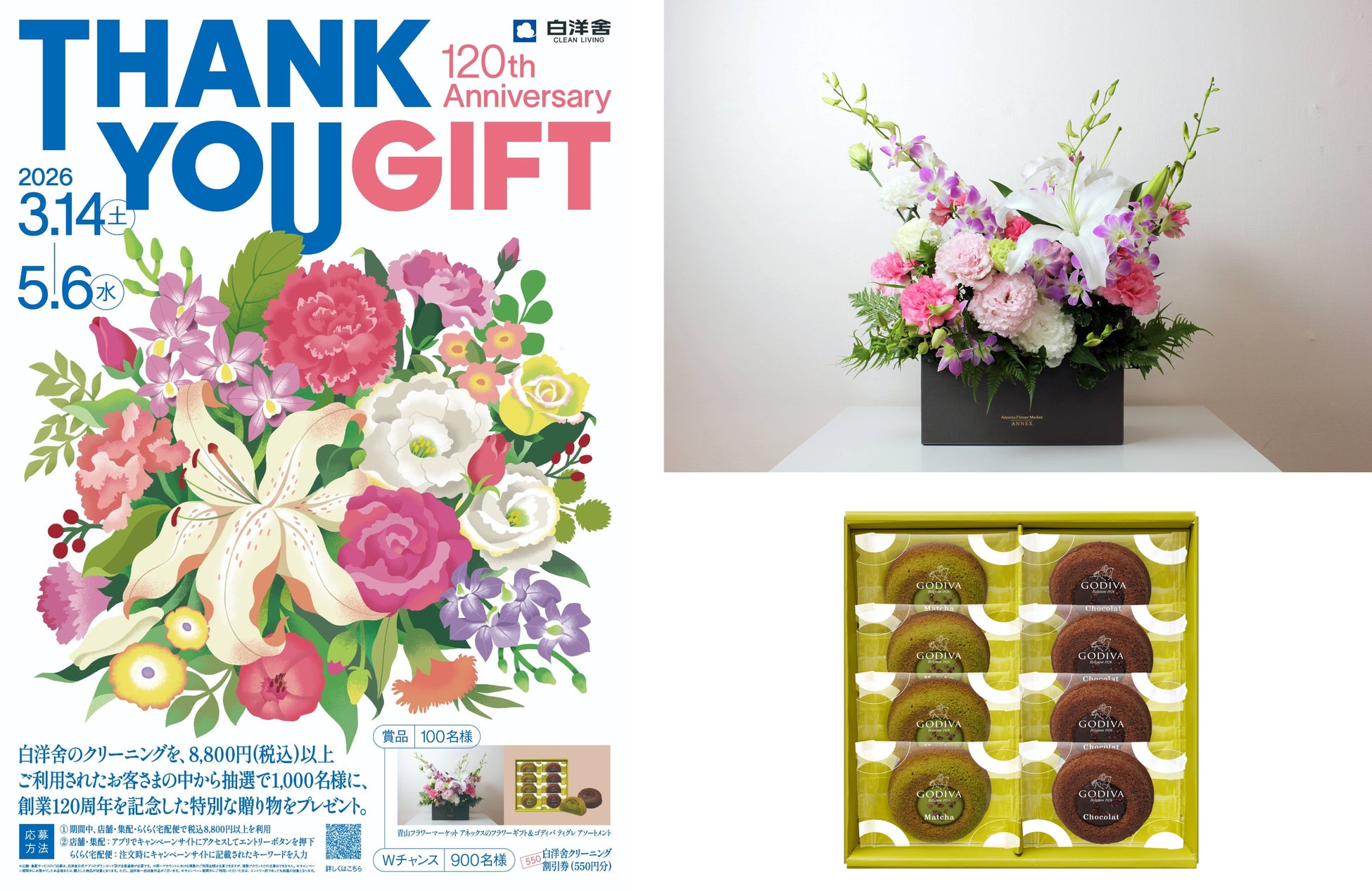 2026年3月14日(土)~5月6日(水)の期間中、店舗・集配・らくらく宅配便の各窓口において、8,800円(税込)以上のサービスをご利用いただいたお客様の中から、抽選で100名様に「オリジナルフラワーギフト」(青山フラワーマーケット アネックス)と「抹茶 ティグレ アソートメント 8個入り」(ゴディバ)をセットでプレゼントいたします。さらにWチャンスとして、抽選で900名様に「白洋舍クリーニング割引券550円分」を進呈いたします。