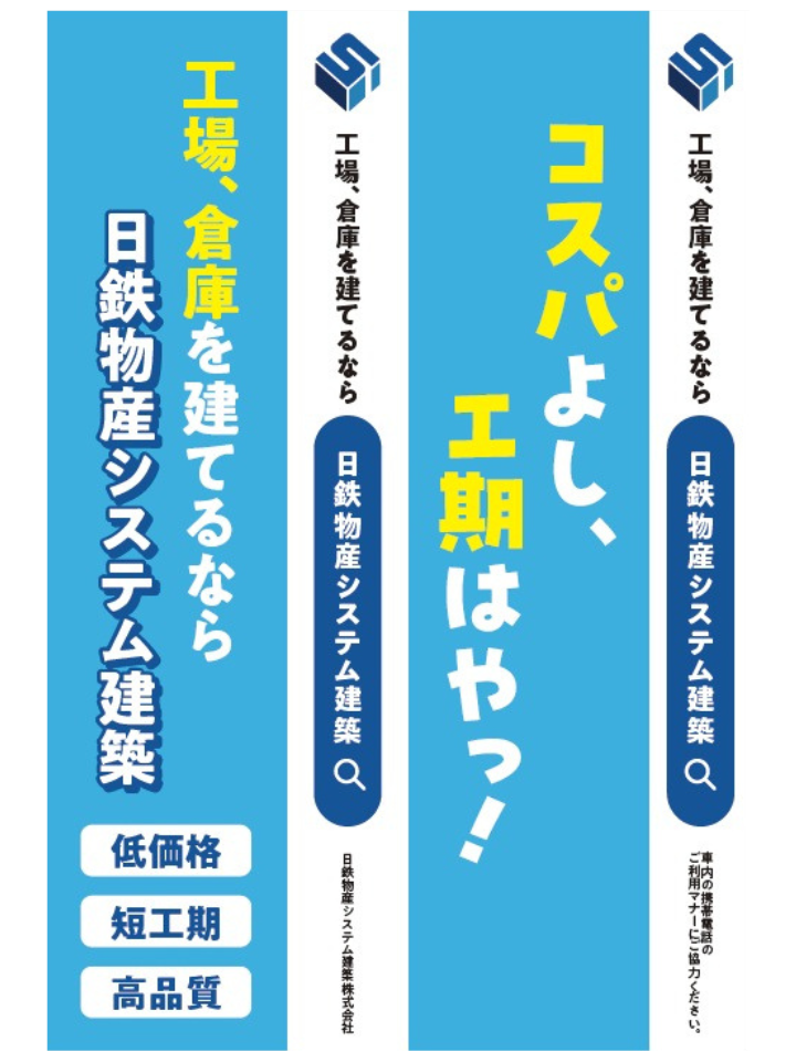 システム建築の専業メーカーである日鉄物産システム建築株式会社(本社:東京都港区、代表取締役社長:生井 敏夫)は、2024年7月12日~2025年7月11日の1年間、全編成のうち1編成の2車両にてつり革広告を掲出いたします。お乗り合わせの際は、ぜひご覧ください。