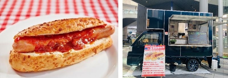 看板メニューの福生ドッグは自慢の手作りパンに国産豚100%のソーセージを挟み、クリームチーズ、特製サルサソースをかけたこだわりの逸品です!