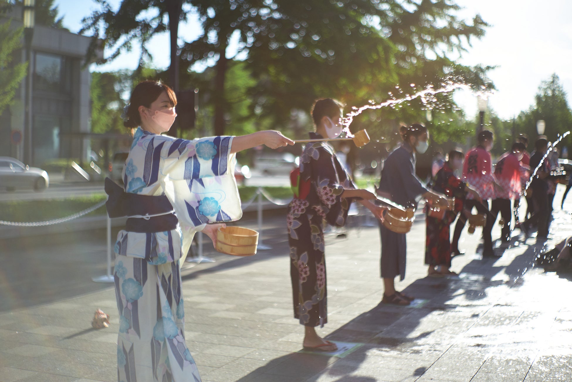 丸の内エリアの夏の風物詩である「丸の内 de 打ち水」を行幸通りにて実施。今年は最大50人で一斉に打ち水が可能。打ち水で使用する水は、大丸有地区内のビルから排出された中水を利用し、SDGsの観点から参加者の皆様に環境を意識いただく機会を提供します。どなたでも打ち水体験に参加いただくことができ、昔ながらの日本の文化をお楽しみいただけます。