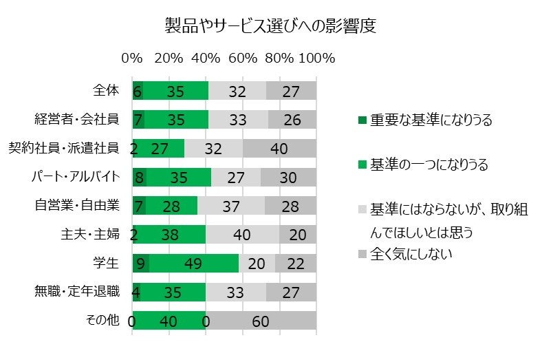 「あなたは、製品やサービスを選ぶときに、地球温暖化/気候変動問題のための取組をどの程度重視しますか。」という問いに対して、「重要な基準になりうる」と「基準の一つになりうる」を合わせた、製品やサービスの脱炭素への取組が製品やサービス選びの基準と考える割合は約4割でした。職業別で見ると、製品やサービスの脱炭素への取組が製品やサービス選びの基準と考える学生の割合は約6割であり、学生が最も高いことが明らかになりました。