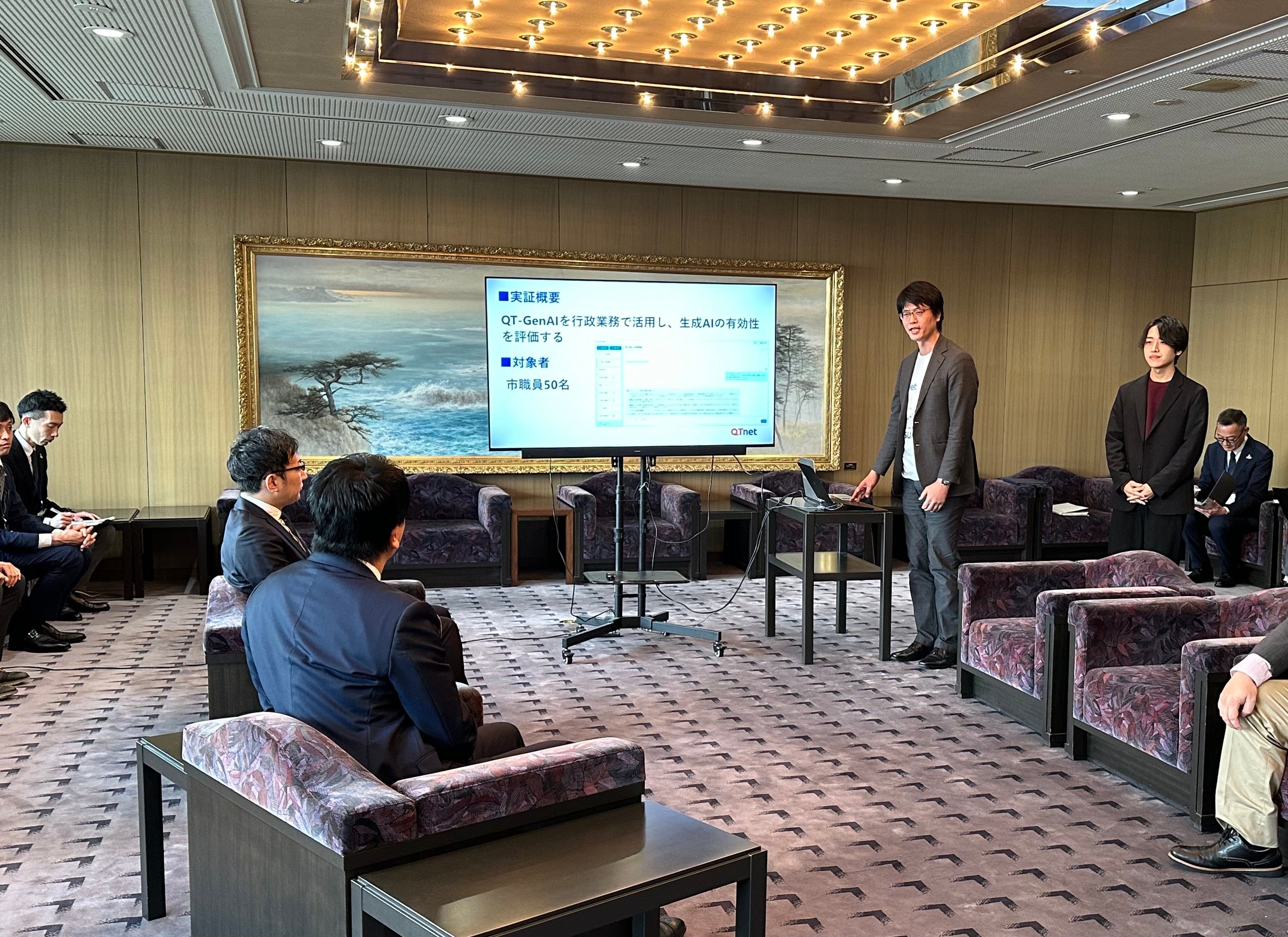 福岡市の高島市長からは、特に「モード機能」に興味を持っていただき、例えば過去の議会答弁を学習させて齟齬のない答弁案を作成する「議会答弁モード」など、自治体のニーズに特化したサービスがあると助かるといったコメントとともに、「QT-GenAI」の更なる展開に期待を寄せていただきました。今後は、生成AIのさらなる利用促進を進めていくと同時に、市民や観光客に向けた新しい価値の提供といった、先進的で実利の見込める取り組みに生成AIの活用を進めていく計画を立ててまいります。今後も市との連携を深め、活用の輪を広げ、福岡市が生成AIを最も活用している自治体となるべく取り組みを進めてまいります。