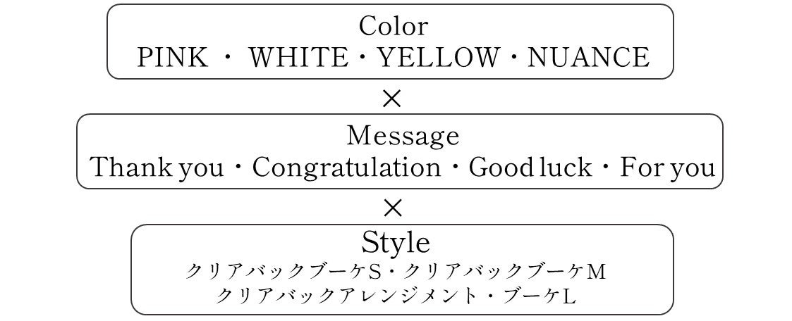 販売価格:クリアバックブーケSセット…¥2,600・クリアバックブーケMセット…¥3,300・クリアバックアレンジメントセット…¥3,000 (以上すべて税込)