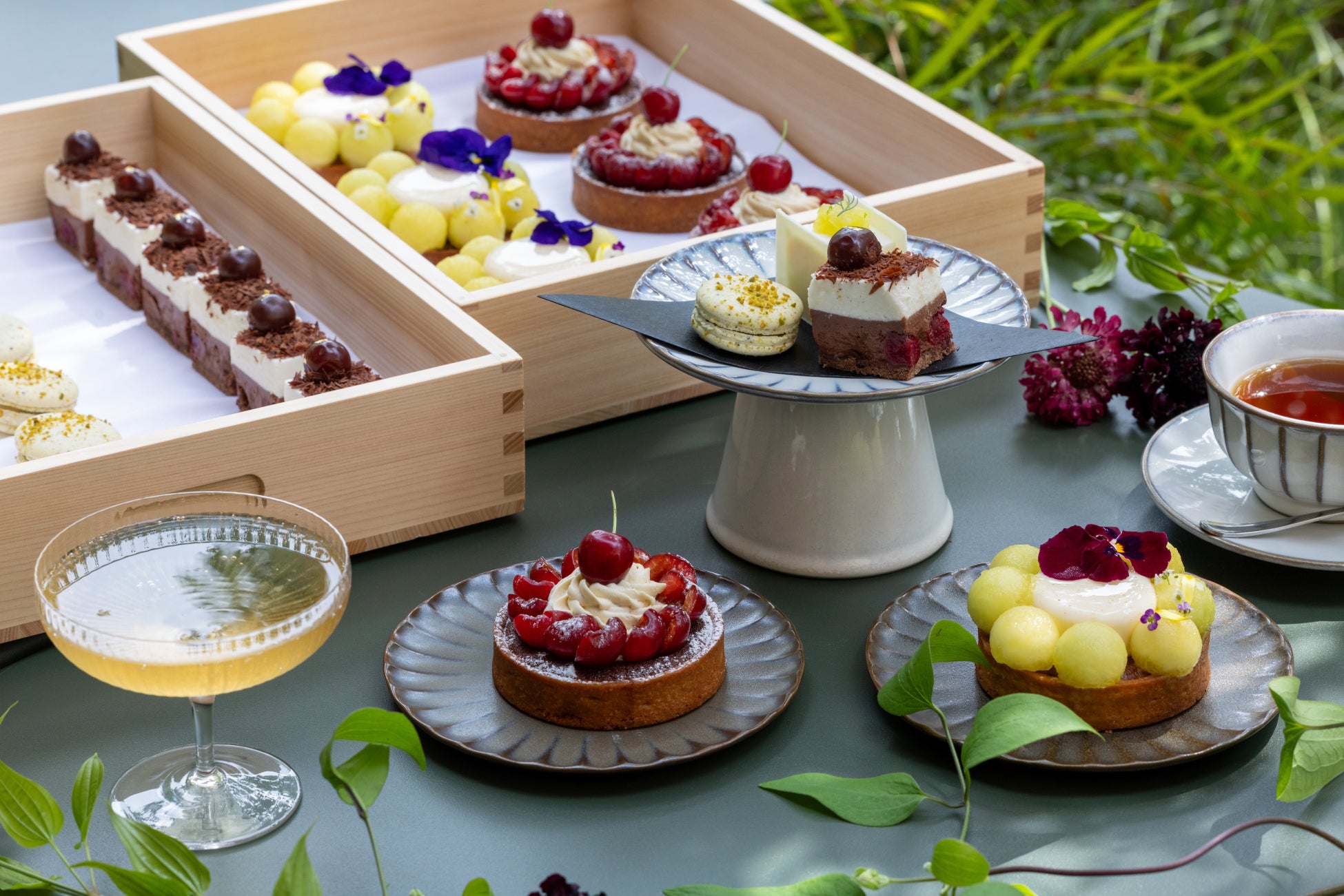 旬の味覚をふんだんに取り入れたスイーツと、特別に考案されたオリジナルドリンクのペアリングを楽しむ「スイートアフタヌーン」。5月・6月は、みずみずしいメロンと芳醇なチェリーを主役に、初夏にぴったりのスイーツをご提供いたします。