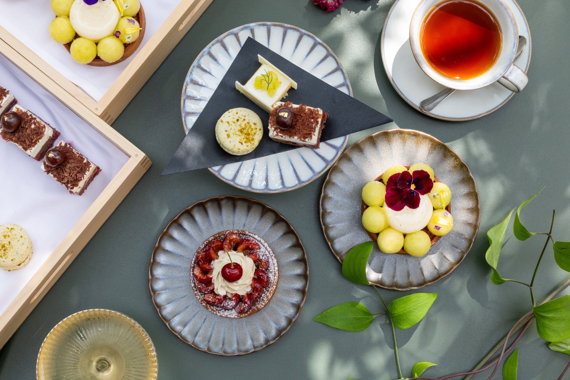 また、一口サイズの見た目も愛らしいパスティッチーニは、3種類からセレクト可能。シェフおすすめの「キルシュ香るチェリーとチョコレートのムース」は、キルシュ漬けにしたグリオットチェリーと濃厚なチョコレートムースが織りなす深い味わいを堪能できる一品。さらに、メロン本来の甘さを活かし、フレッシュなライムでアクセントを添えた「静岡県産メロンのショートケーキ」など、旬の魅力を凝縮したスイーツをお楽しみいただけます。爽やかな風が心地よいテラスでのティータイムや、ランチ後の軽いデザートタイムにも最適な「メロン&チェリースイートアフタヌーン」。ご自身のスタイルに合わせてお楽しみいただきながら、優雅な午後のひとときをお過ごしください。